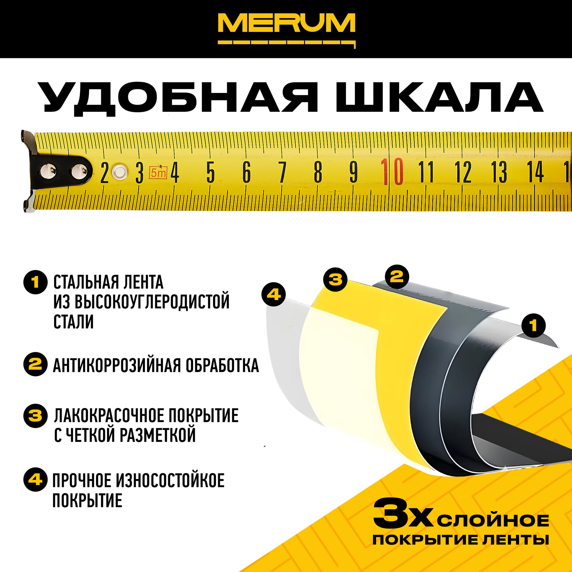 10 цен на Рулетка строительная, MERUM, ABS-пластик, 5м x 25мм, сталь, профессиональная, двойной зацеп