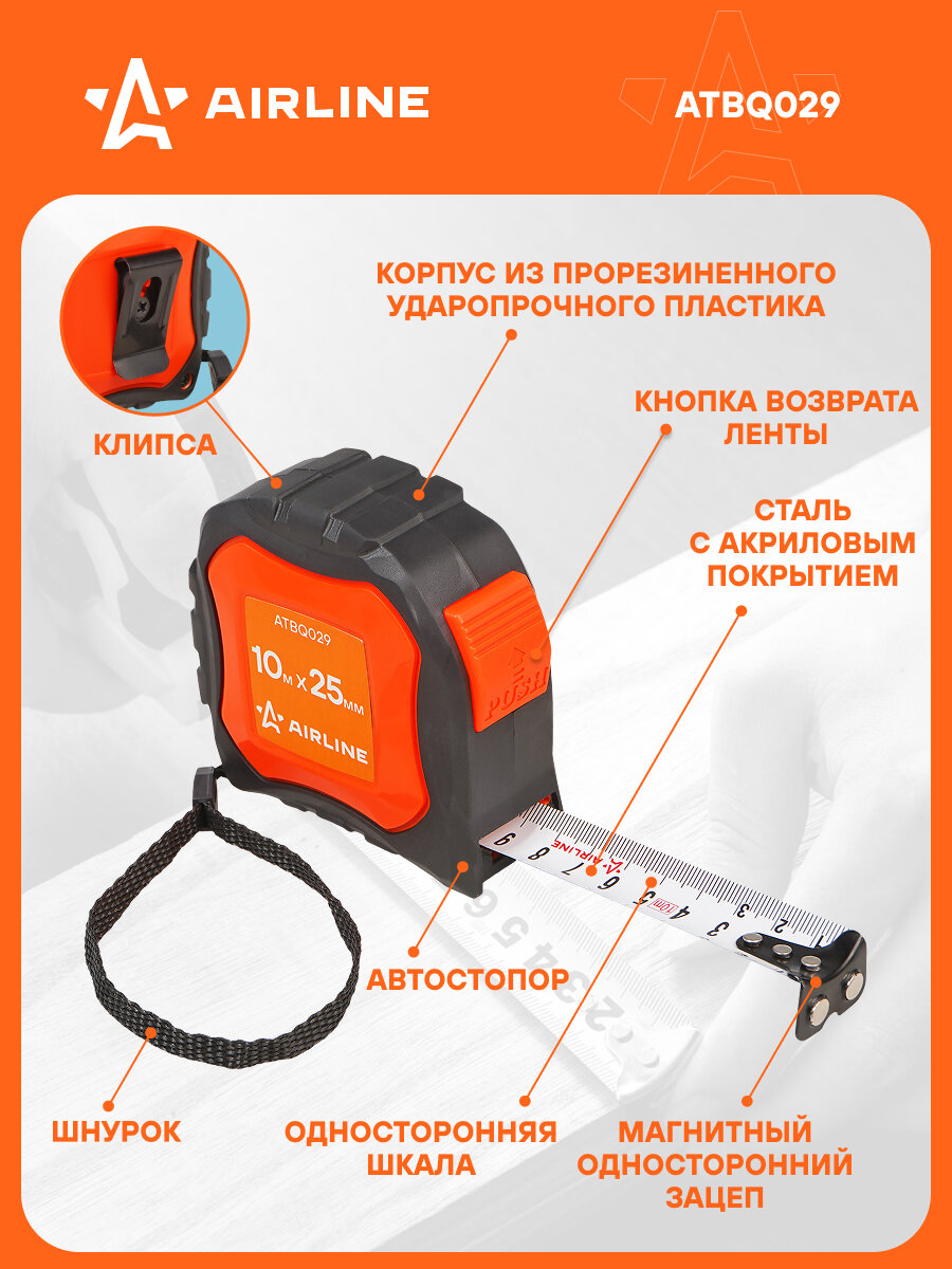 Рулетка в прорезиненном корпусе 10мх25мм, автостоп, магнитный зацеп ATBQ029 AIRLINE информация: