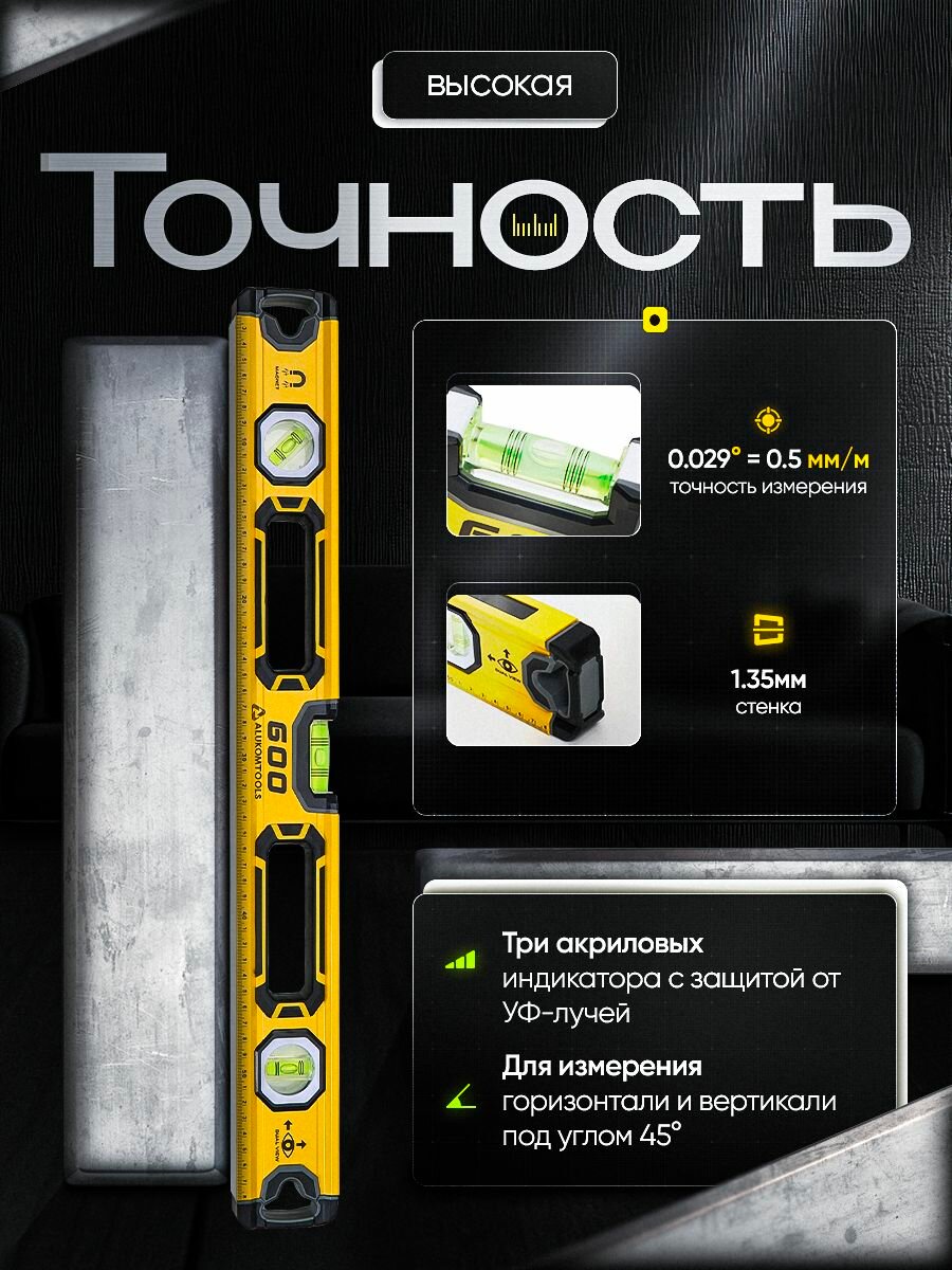 Уровень строительный магнитный усиленный пузырьковый, 600 мм, 3 индикатора, фрезерованный, зеркальный глазок информация: