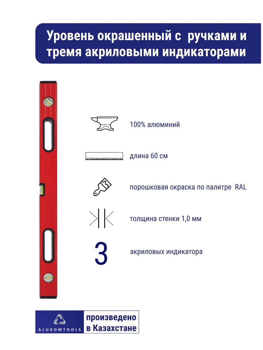 Уровень окрашенный с ручками и 3 индикаторами Alukomtools 60 см, красный ,100% алюминий информация: