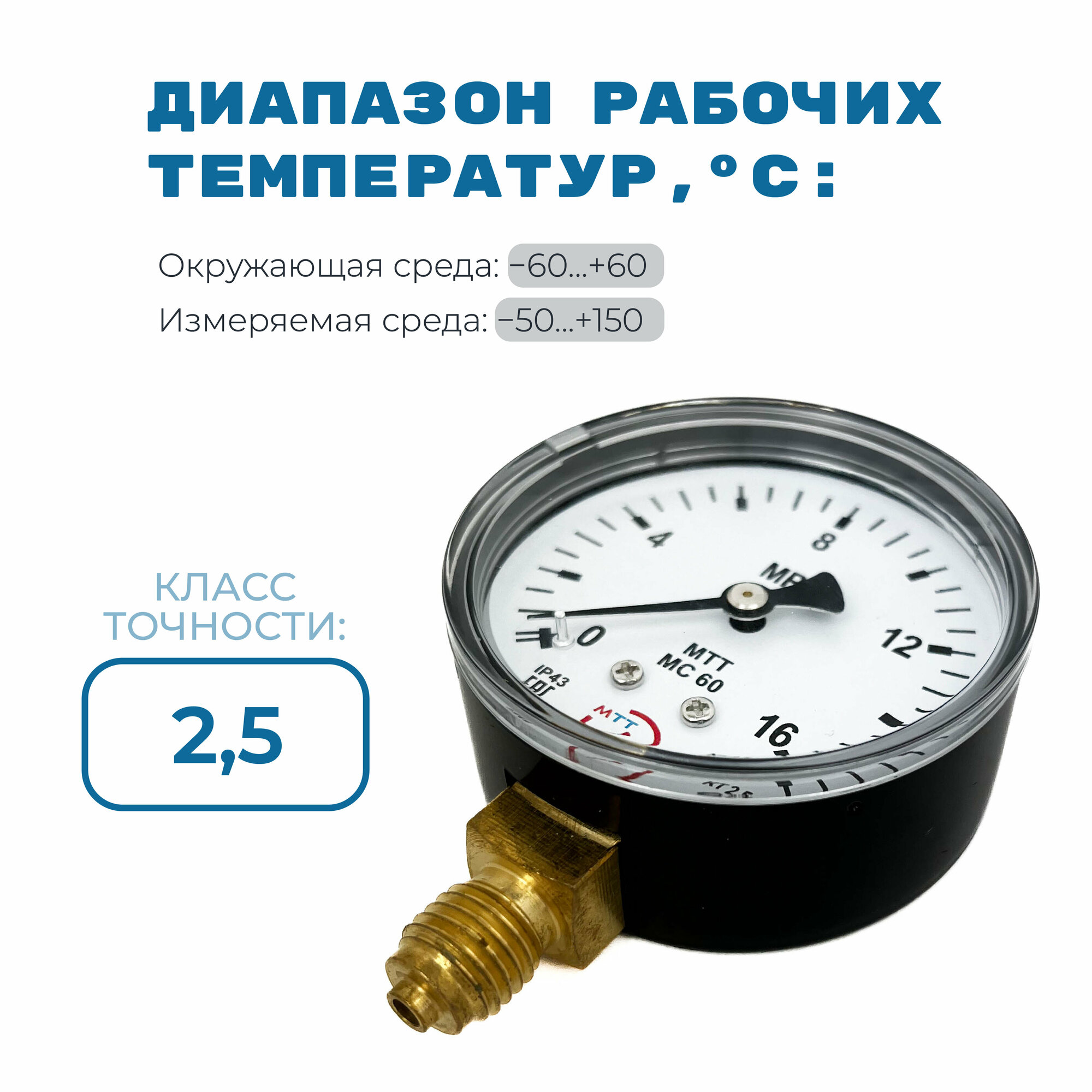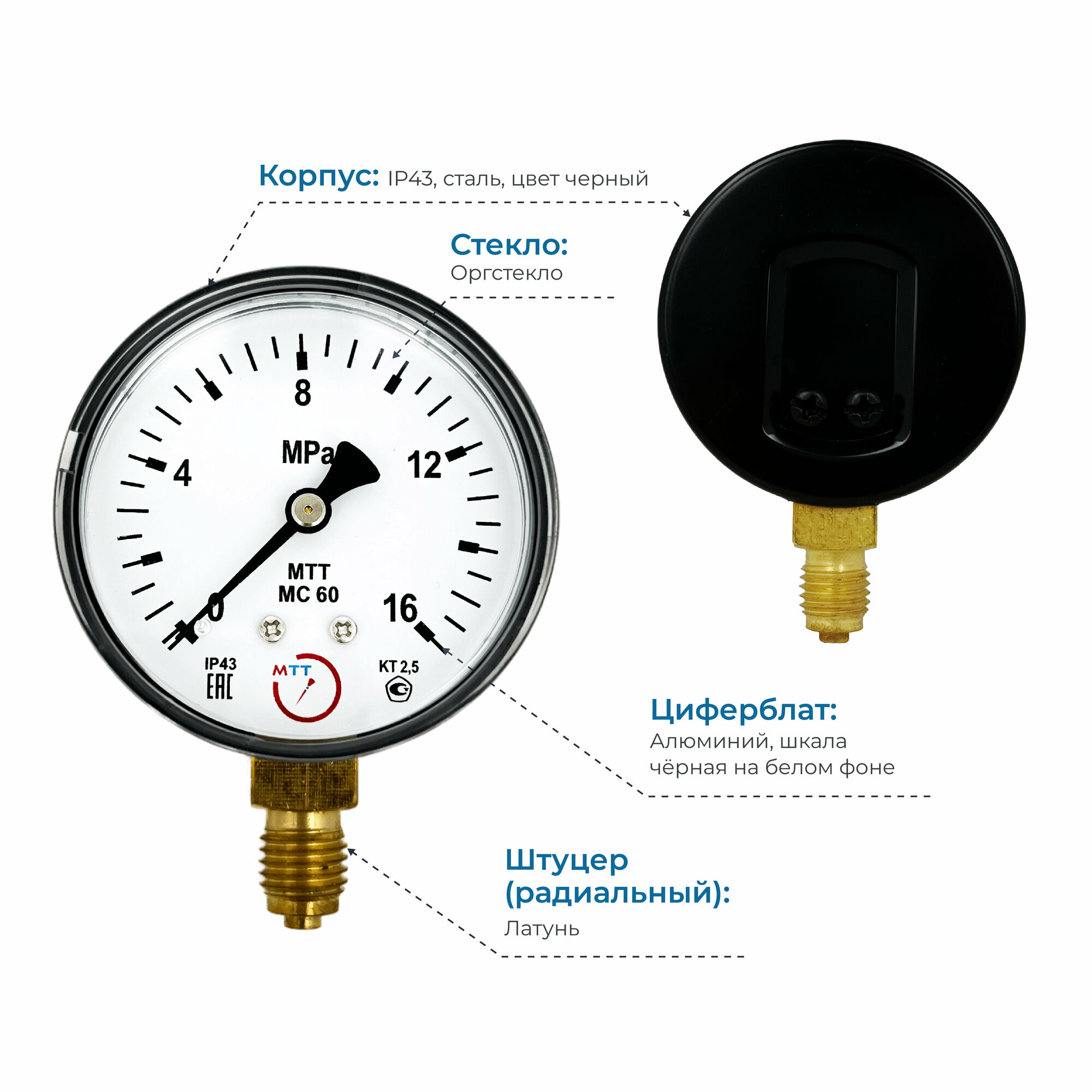 Отзывы на Манометр МС60 давление 0-16 МПа (160 бар) резьба М12х1.5 класс точности 2,5 корпус 62 мм. поверка 2 года