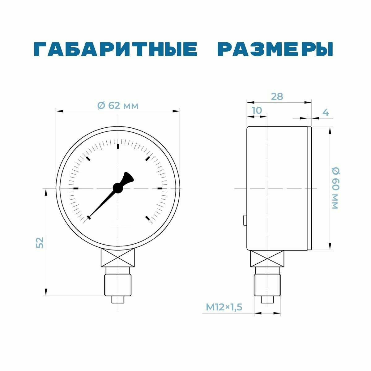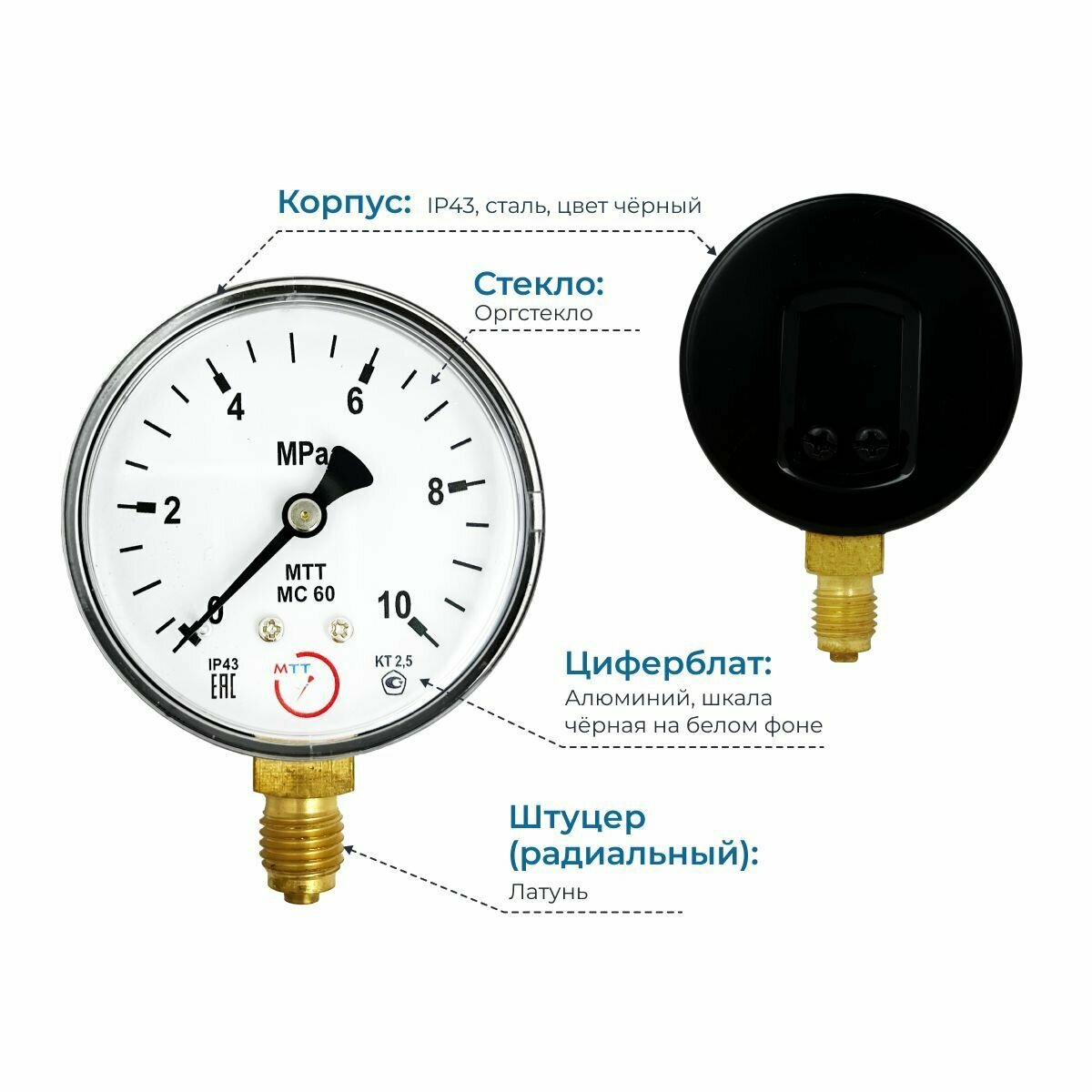Манометр МС60 давление 0-10 МПа (100 бар) резьба М12х1.5 класс точности 2,5 корпус 62 мм. поверка 2 года информация: