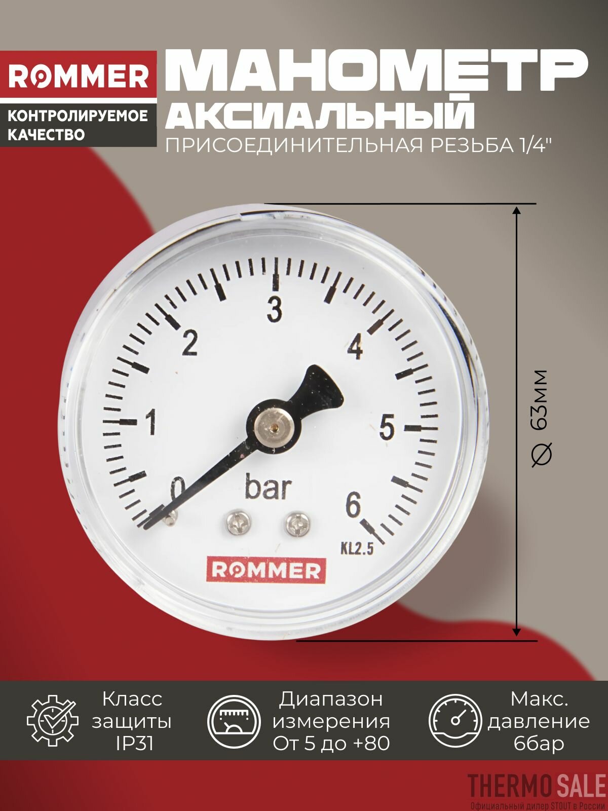 Манометр для водоснабжения 1/4 аксиальный корпус Dn 63 мм 0-6 бар, кл.2.5, ФУМ лента информация: