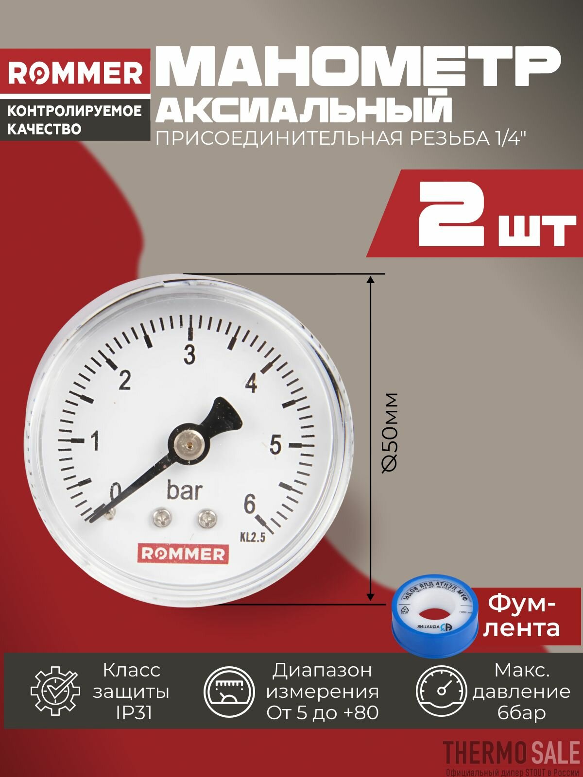 Манометр для водоснабжения 1/4 аксиальный комплект 2 шт корпус Dn 50 мм 0-6 бар, кл.2.5, ФУМ лента информация:
