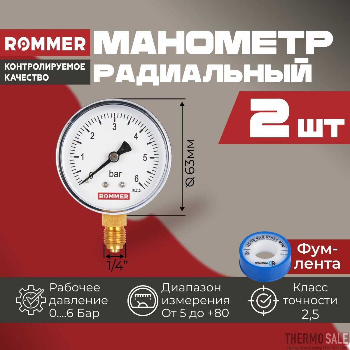 10 цен на Манометр для водоснабжения 1/4 радиальный комплект 2 шт корпус Dn 63 мм 0-6 бар, кл.2.5, ФУМ лента