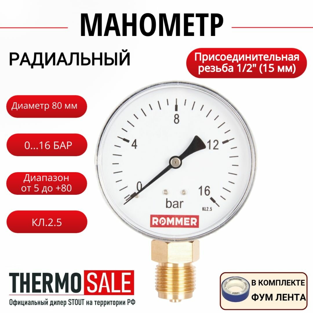 Манометр радиальный корпус Dn 80 мм 1/4", 0-16 бар, кл.2.5, ФУМ лента информация: