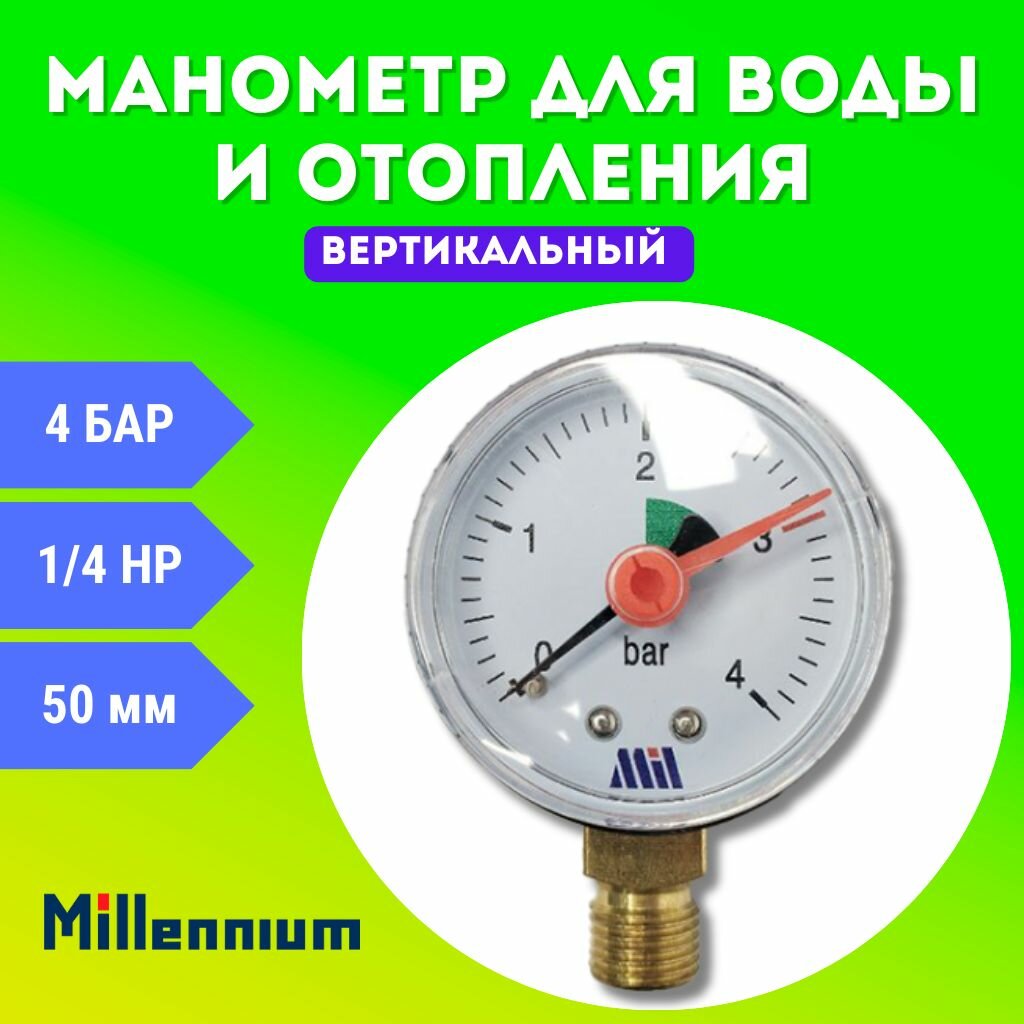 Манометр для воды и отопления 4 бар 1/4 НР Millennium информация: