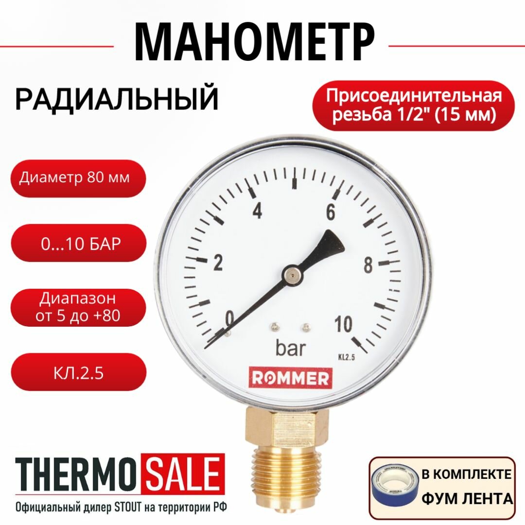 Манометр радиальный корпус Dn 80 мм 1/4", 0-10 бар, кл.2.5, ФУМ лента информация: