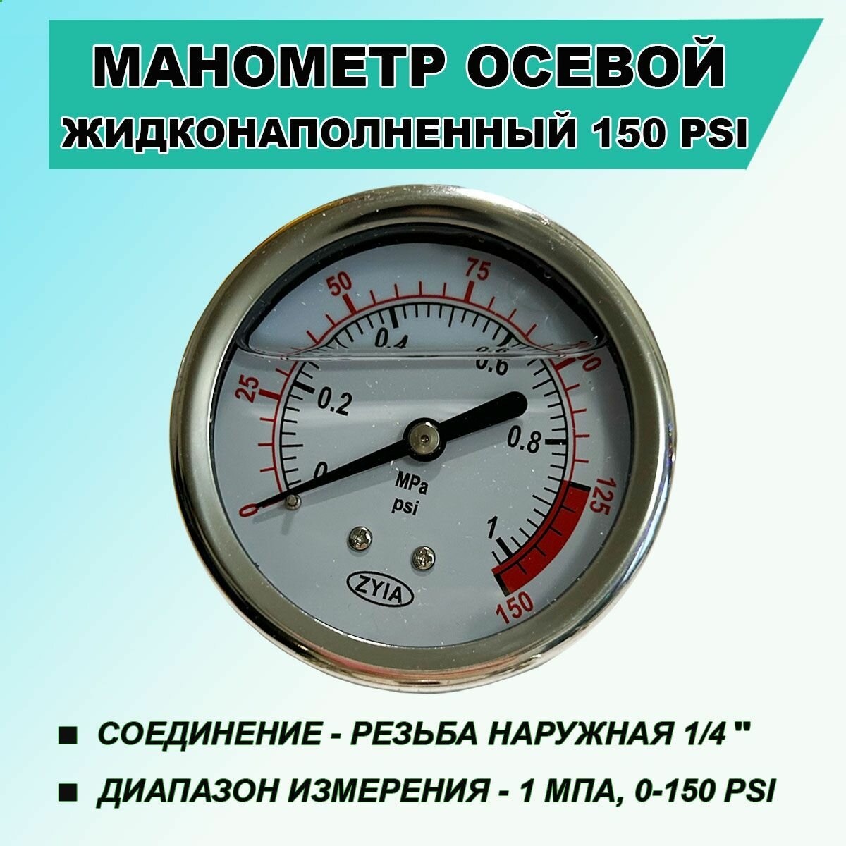 Манометр осевой (axial) жидконаполненный PG150 (1 МПа, 0-150 psi), соединение - резьба 1/4" информация: