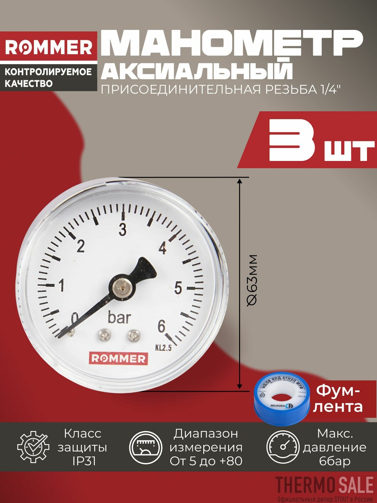 10 цен на Манометр для водоснабжения 1/4 аксиальный комплект 3 шт корпус Dn 63 мм 0-6 бар, кл.2.5, ФУМ лента