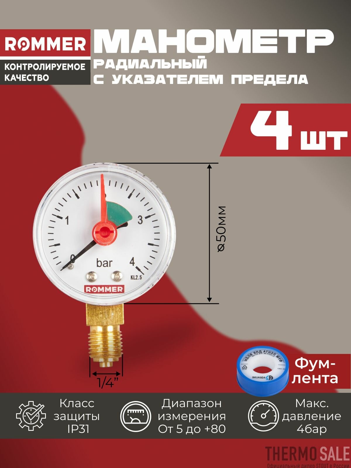 Манометр для водоснабжения 1/4 радиальный с указателем предела 4 шт корпус Dn 50 мм 0-4 бар, кл.2.5, ФУМ лента информация: