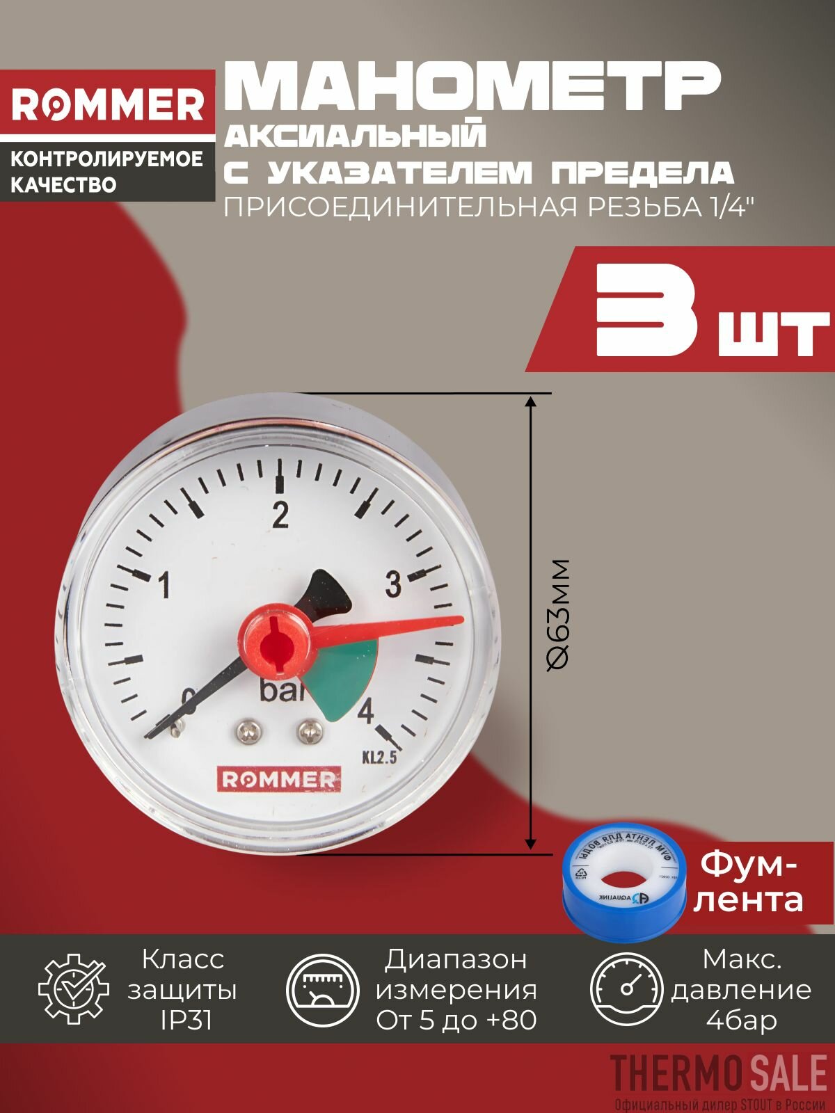 10 цен на Манометр для водоснабжения 1/4 аксиальный с указателем предела 3 шт корпус Dn 63 мм 0-4 бар, кл.2.5, ФУМ лента