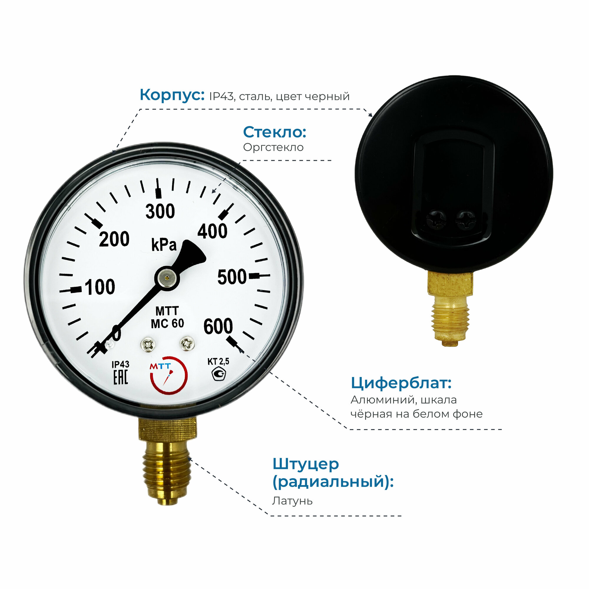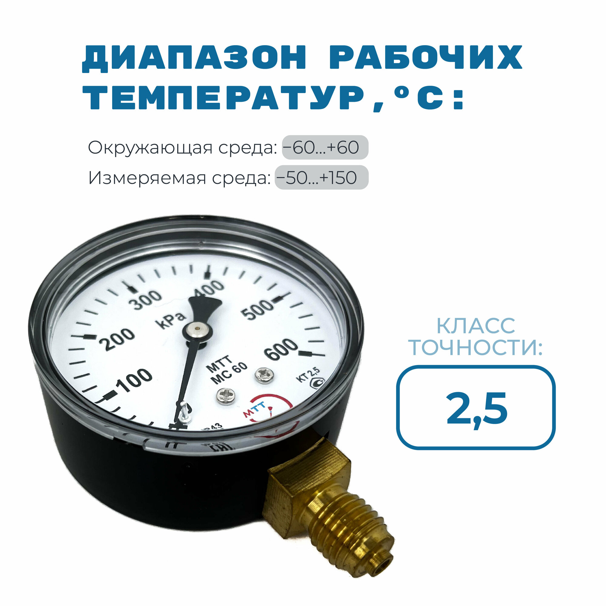 Отзывы на Манометр МС60 давление 0-600 кПа (6 бар) резьба М12х1.5 класс точности 2,5 корпус 62 мм. поверка 2 года
