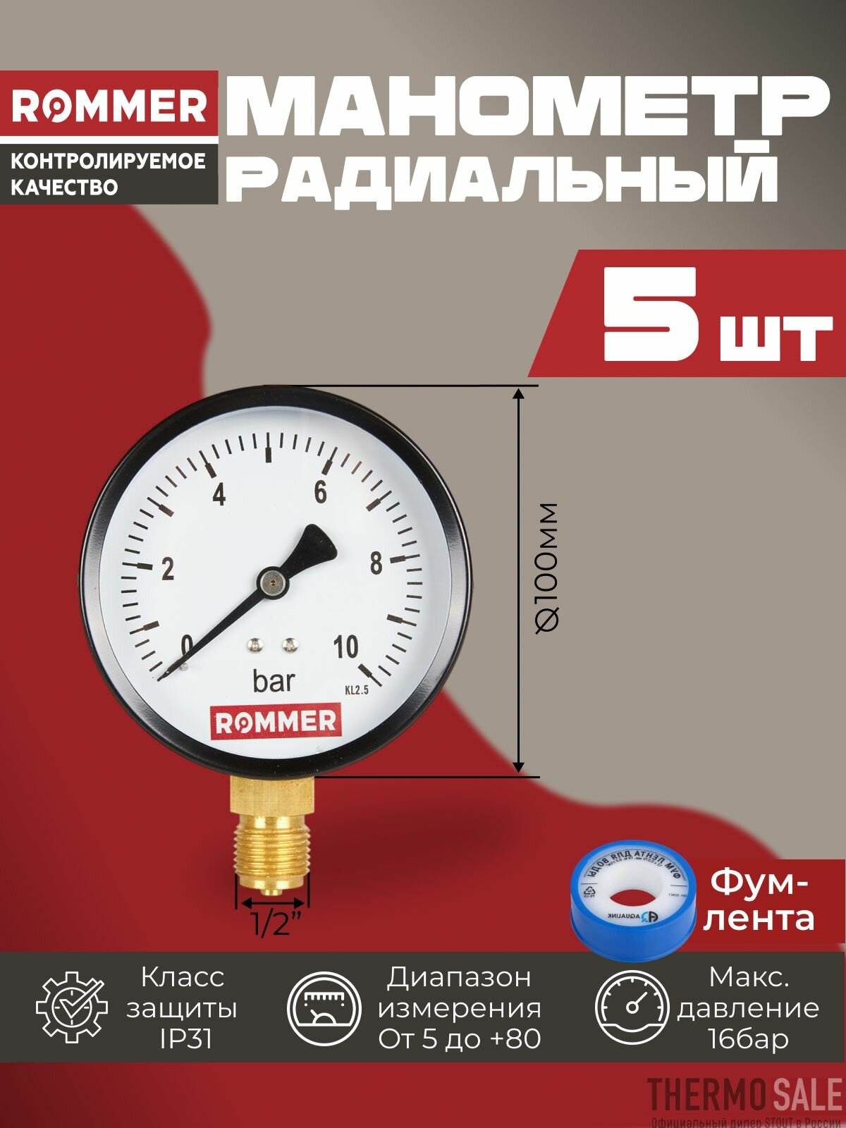 Манометр для водоснабжения 1/4 радиальный комплект 5 шт корпус Dn 100 мм 0-16 бар, кл.2.5, ФУМ лента информация:
