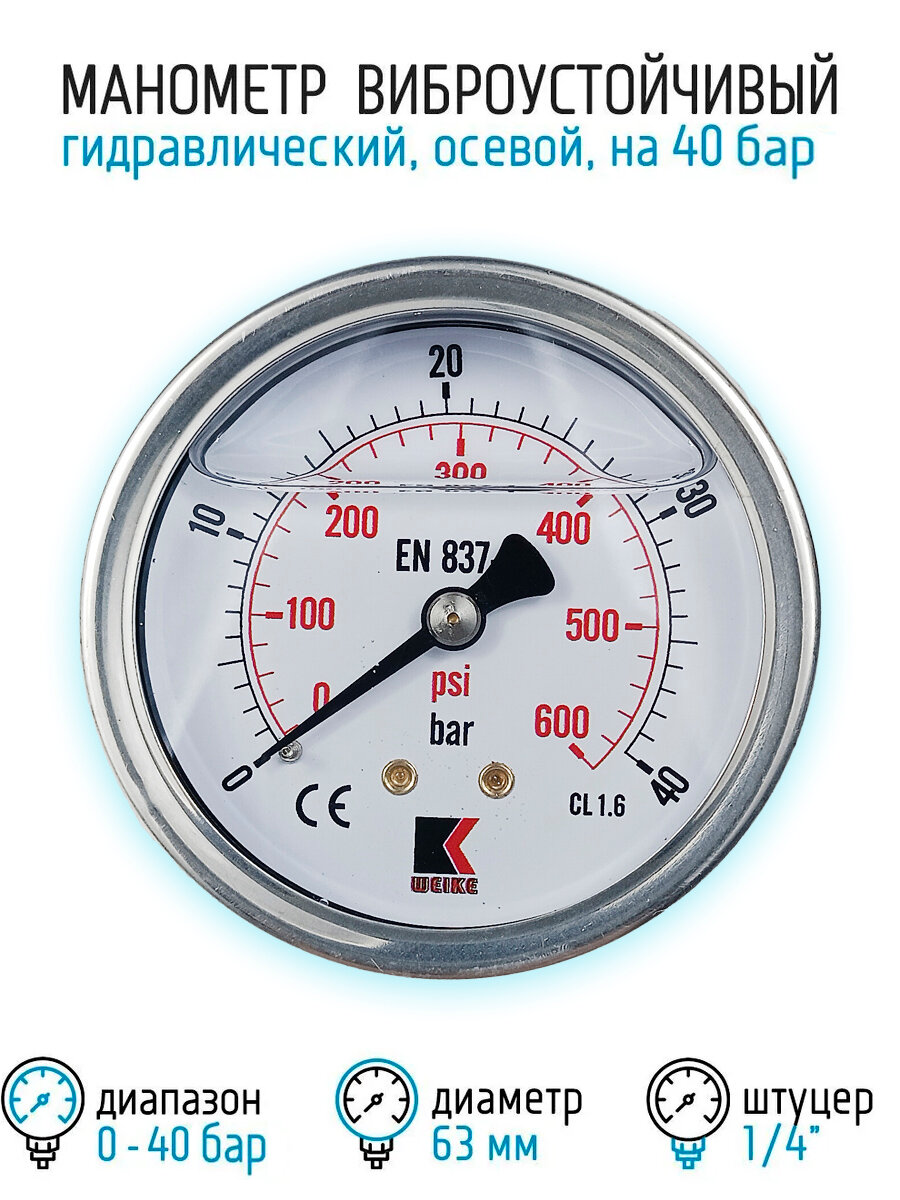Манометр гидравлический на 40 бар (600 psi), 63 мм, G 1/4" осевой, виброустойчивый - глицериновый информация: