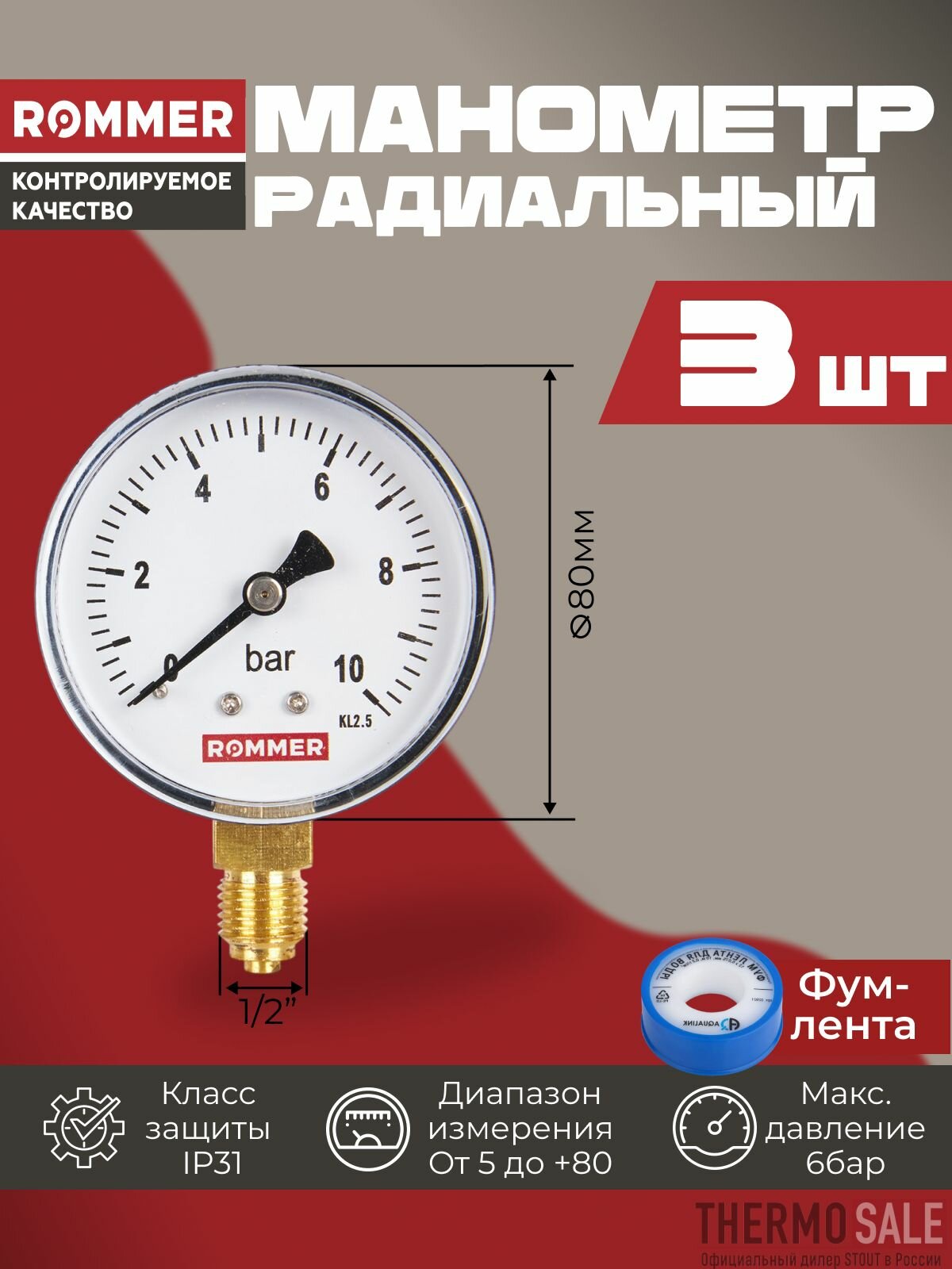 10 цен на Манометр для водоснабжения 1/2 радиальный комплект 3 шт корпус Dn 80 мм 1/2, 0-6 бар, кл.2.5, ФУМ лента