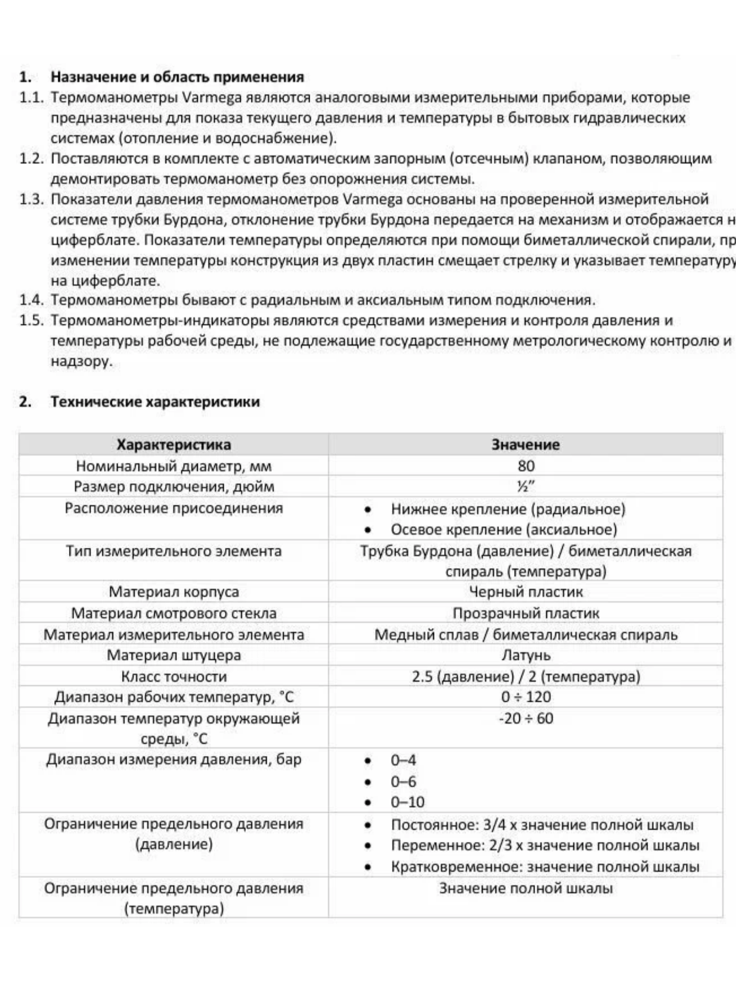 Отзывы на Термоманометр радиальный Varmega VMMT07-801004, диаметр 80 мм, 10 бар, 120°С, 1/2", с запорным клапаном