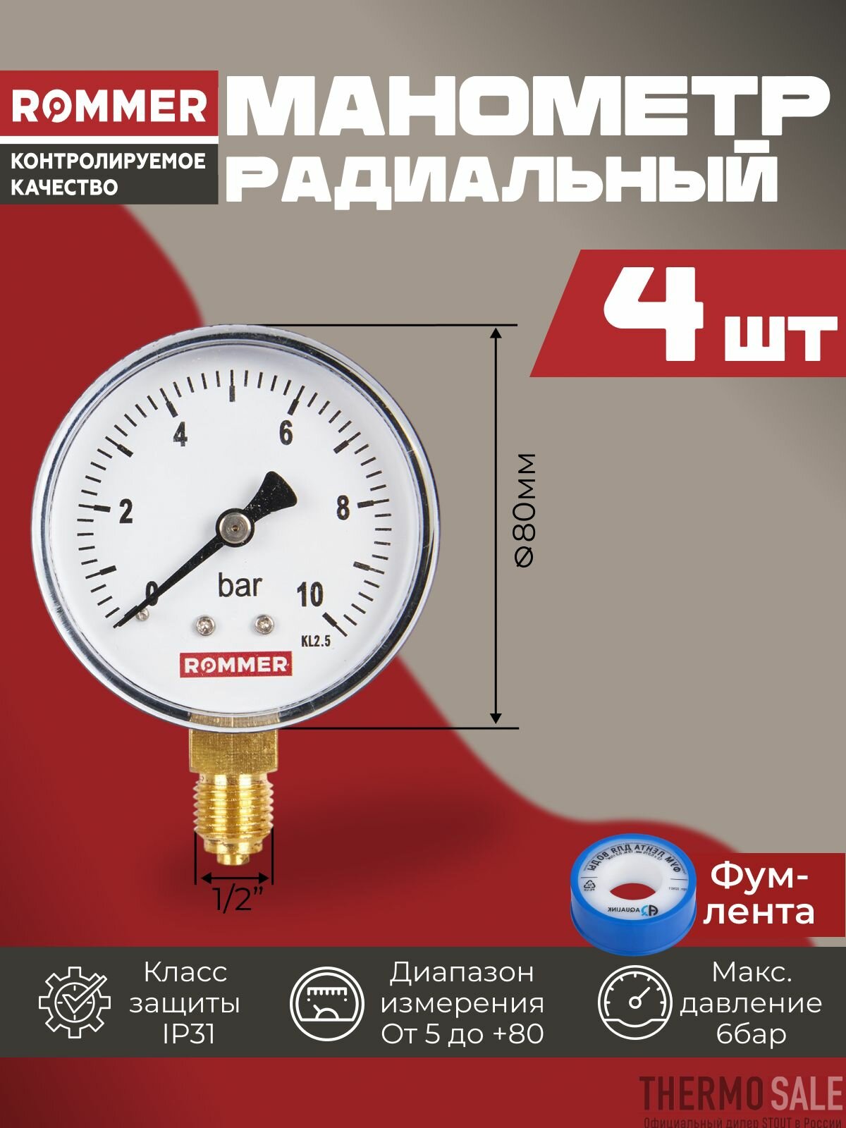 10 цен на Манометр для водоснабжения 1/2 радиальный комплект 4 шт корпус Dn 80 мм 1/2, 0-6 бар, кл.2.5, ФУМ лента