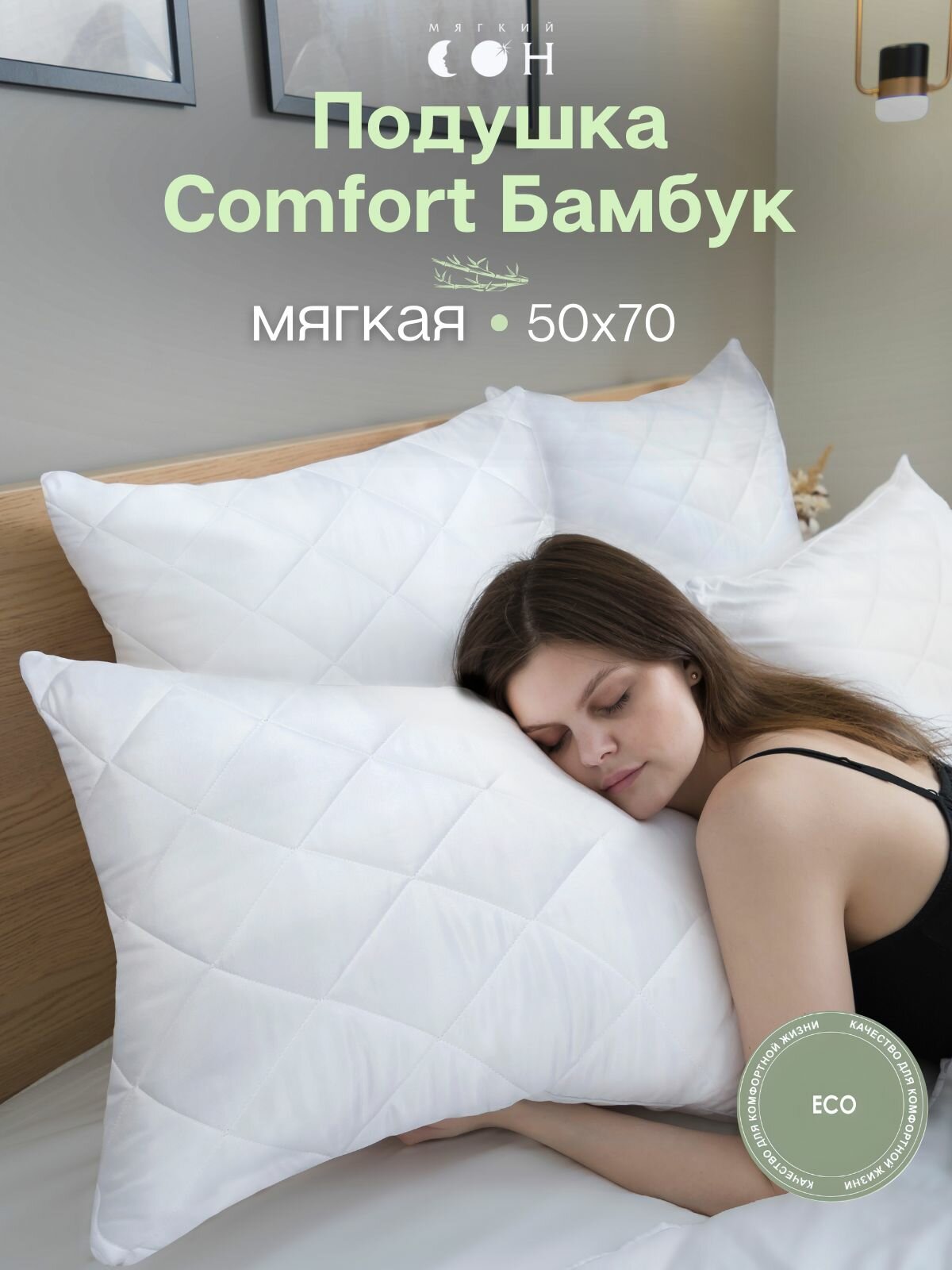 Подушка 50х70 см, для сна, мягкая, бамбуковое волокно, гипоаллергенная информация: