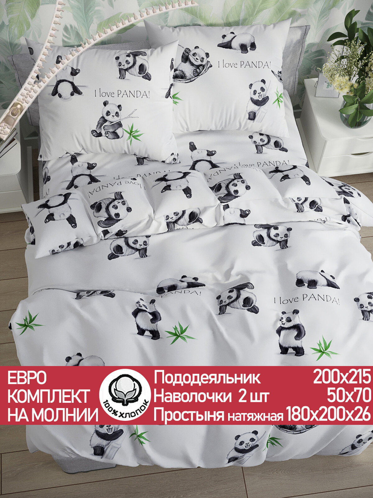 Отзывы на Постельное белье Сказка "Панды" евро наволочки 50х70 2шт Простынь на резинке 180х200 см Пододеяльник 200х215 см
