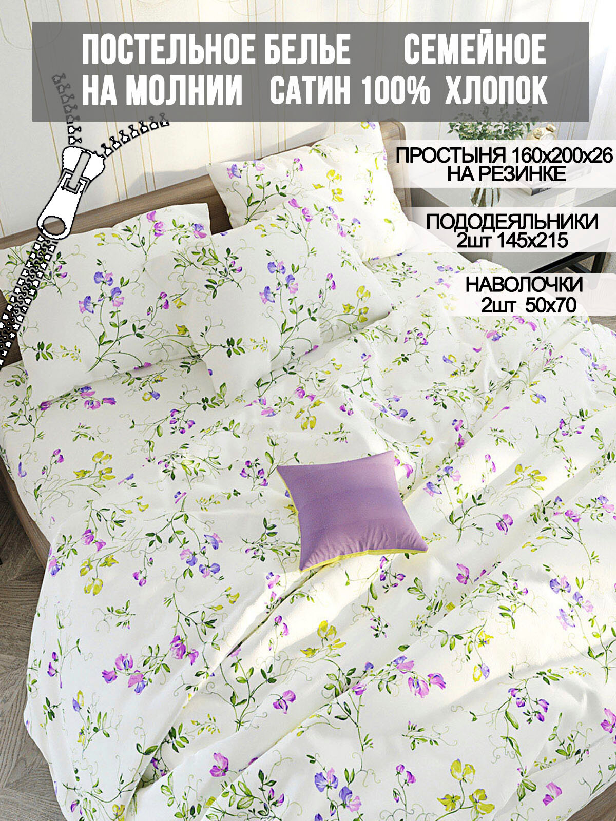 10 цен на Постельное белье сатин Milky Garden "Горошек" семейное, пододеяльник 2шт, наволочки 2шт, простынь на резинке, сатин
