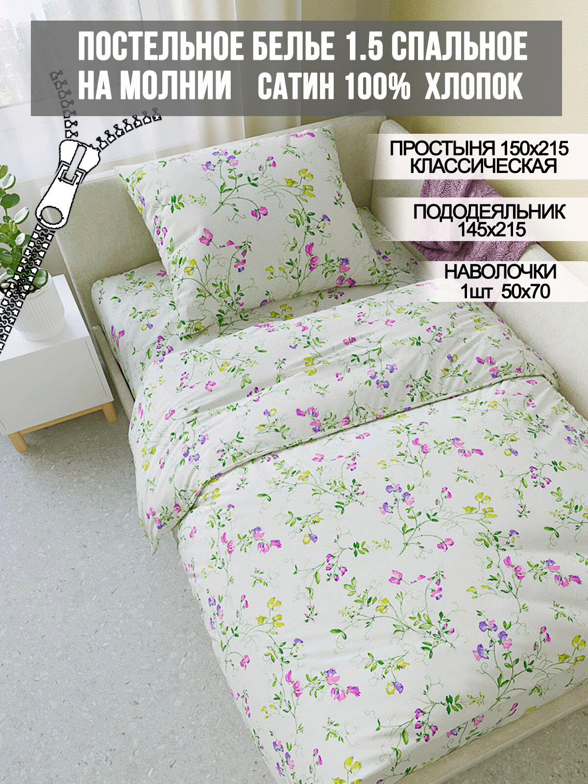 Постельное белье Сказка Сатин "Lester" 1,5-сп наволочка 50х70 1шт Простынь на резинке 90х200 см Пододеяльник 145х215 см