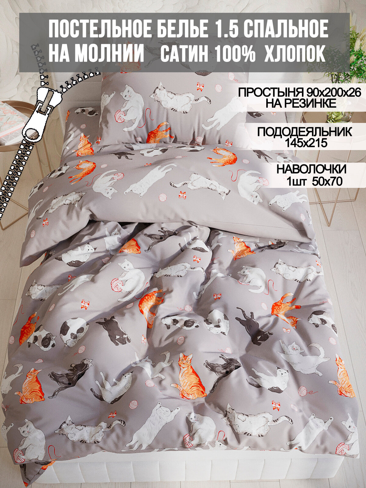10 цен на Постельное белье Milky Garden "Kitties" 1,5-сп, наволочка 50х70 1шт, простынь на резинке 90х200 см, пододеяльник 145х215 см