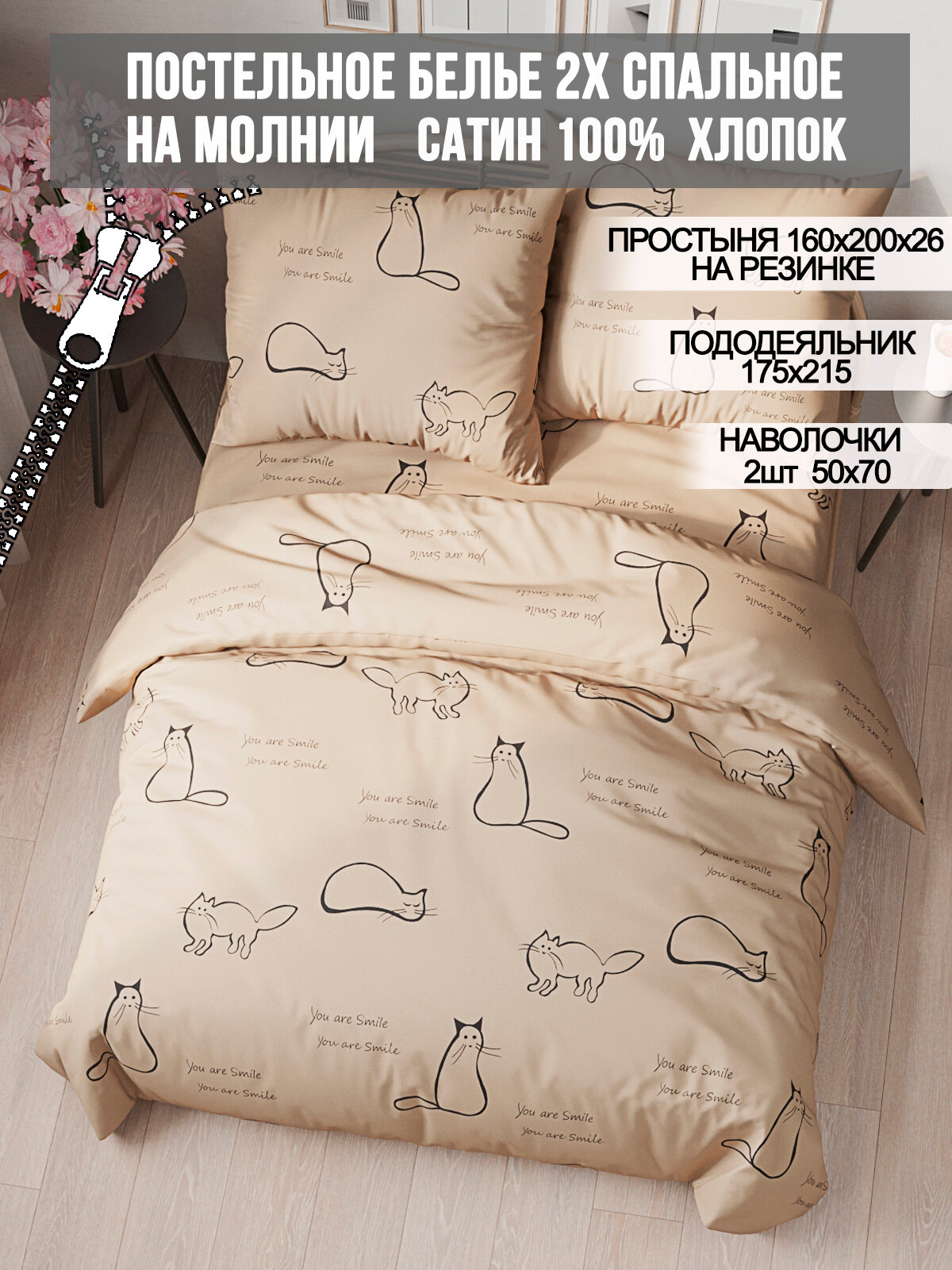 Постельное белье Milky Garden "котики (беж)" евро, сатин, хлопок 100%, наволочка 2шт, простынь на резинке 4 100 ₽