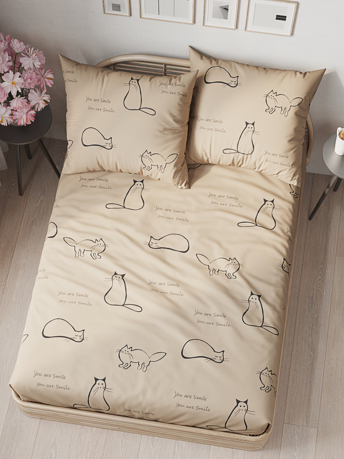Постельное белье Milky Garden "Котики (беж)" 2-спальное, сатин, хлопок 100%, наволочка 2шт, простынь на резинке 3 770 ₽