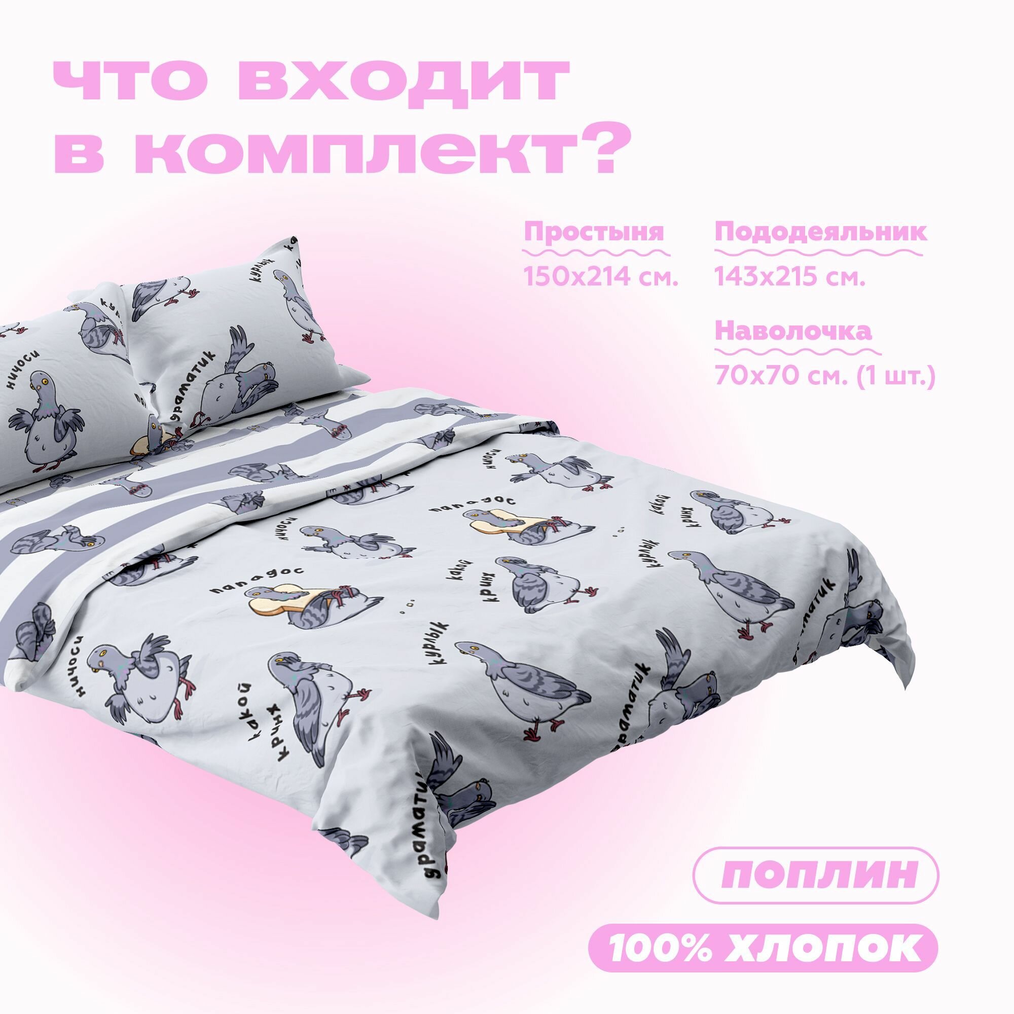 Постельное белье 1.5 спальное Crazy Getup, Поплин, нав. 50х70, Pinky love 1 982 ₽