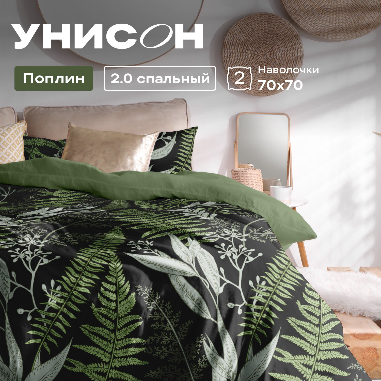 10 цен на Постельное белье 2 спальное Унисон, Поплин, нав. 70х70, Night Fern
