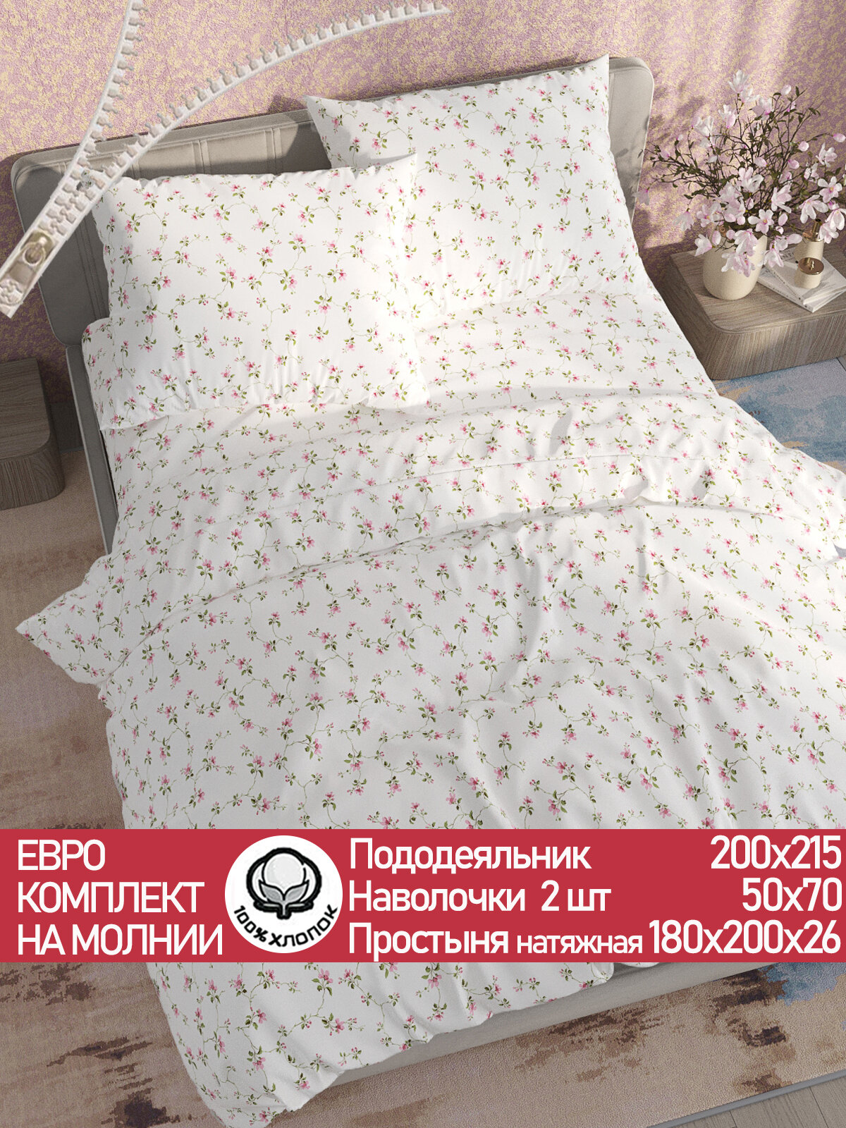 Постельное белье Сказка Сатин "Весна" евро наволочки 50х70 2шт Простынь на резинке 180х200 см Пододеяльник 200х215 см информация: