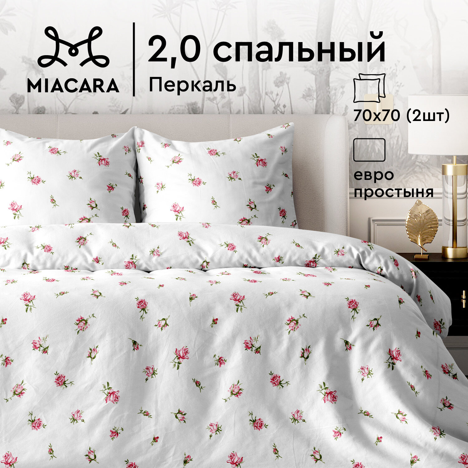 Mia Cara Комплект постельного белья Перкаль, 2х спальный, с простыней Евро, нав. 70х70, Roses Allure информация: