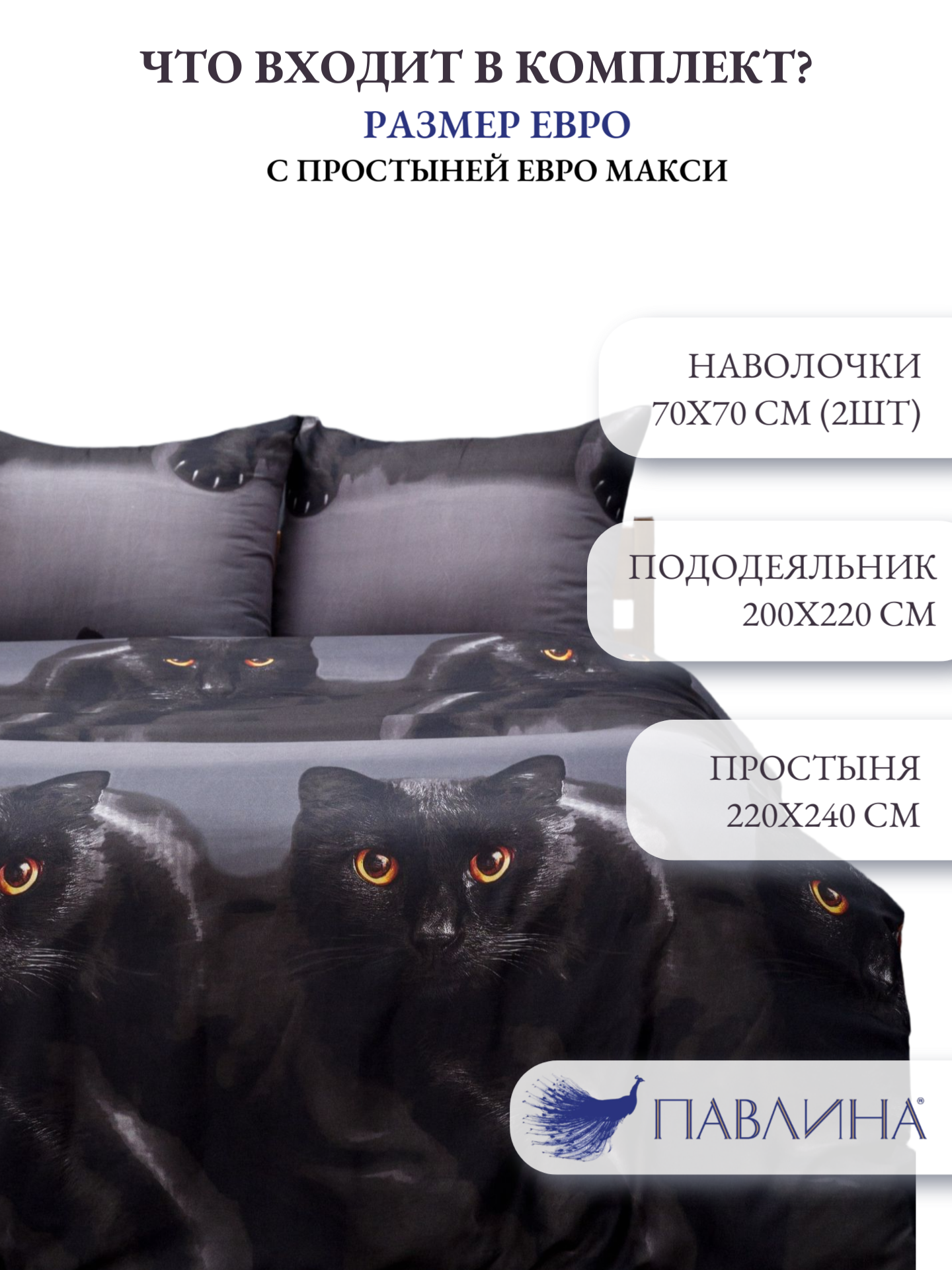 Постельное белье евро макси Павлина Черный котик, Полисатин, наволочки 70x70 информация: