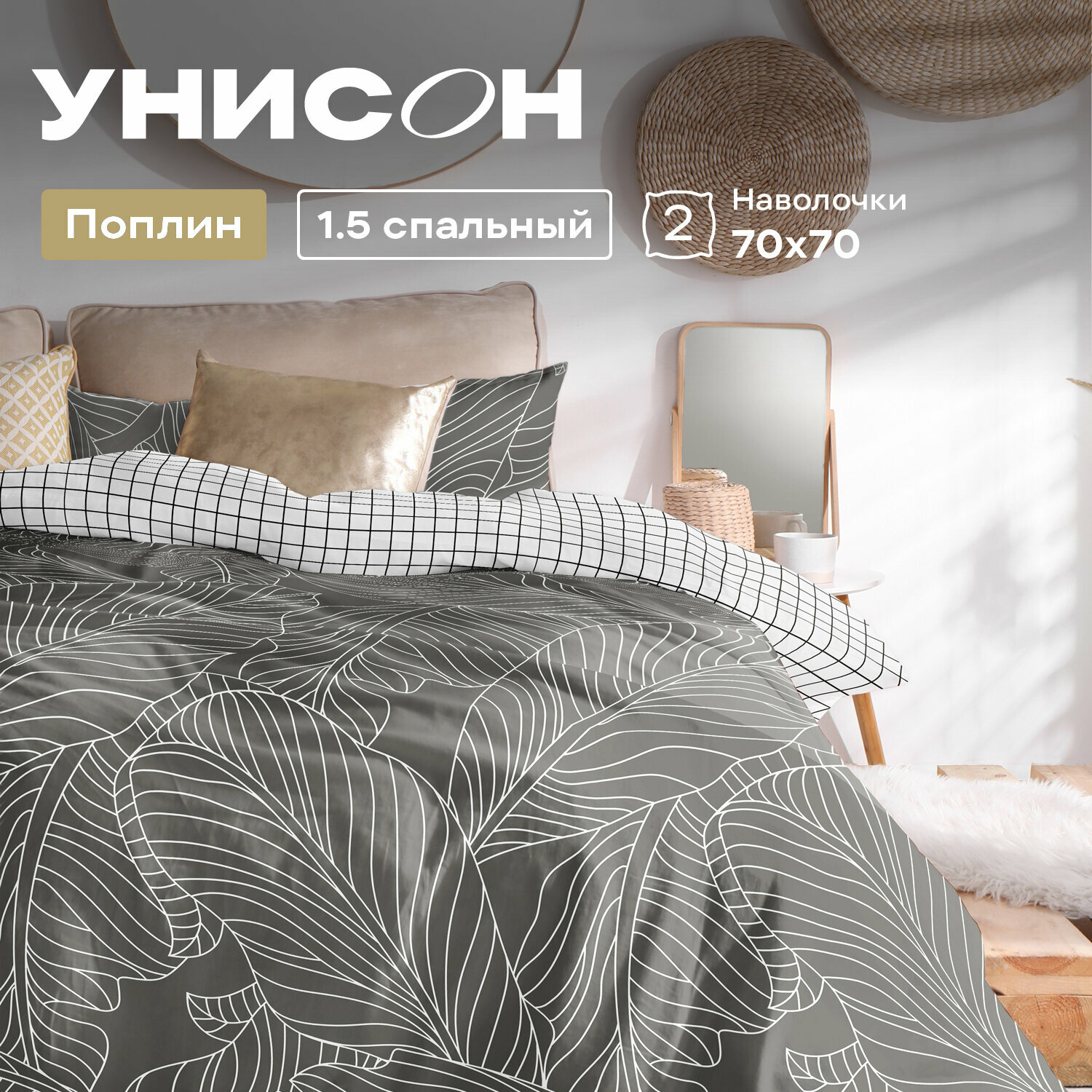 10 цен на Постельное белье 1.5 спальное Унисон, Поплин, нав. 70х70, Palm leaves