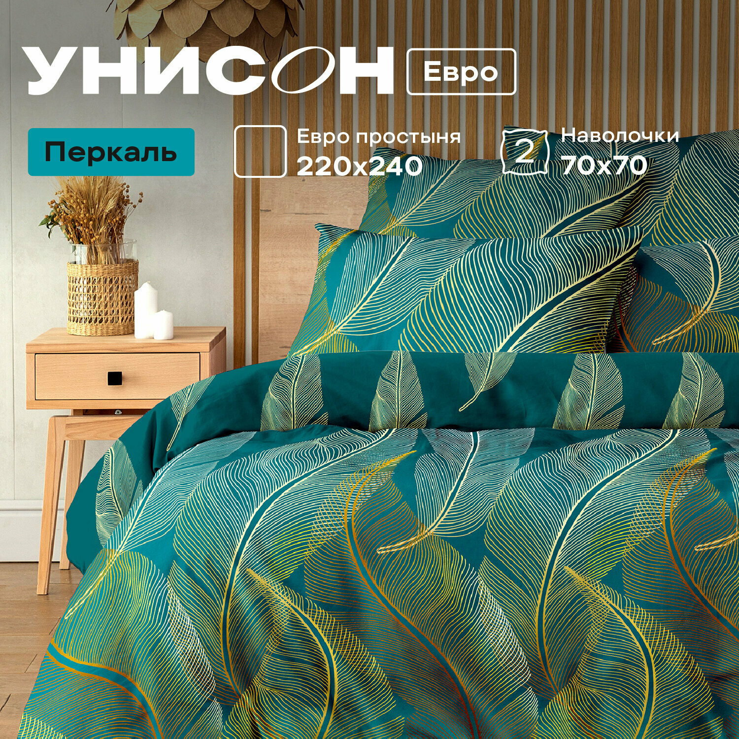 Постельное белье Евро Унисон, Перкаль, нав. 70х70, Feathers информация: