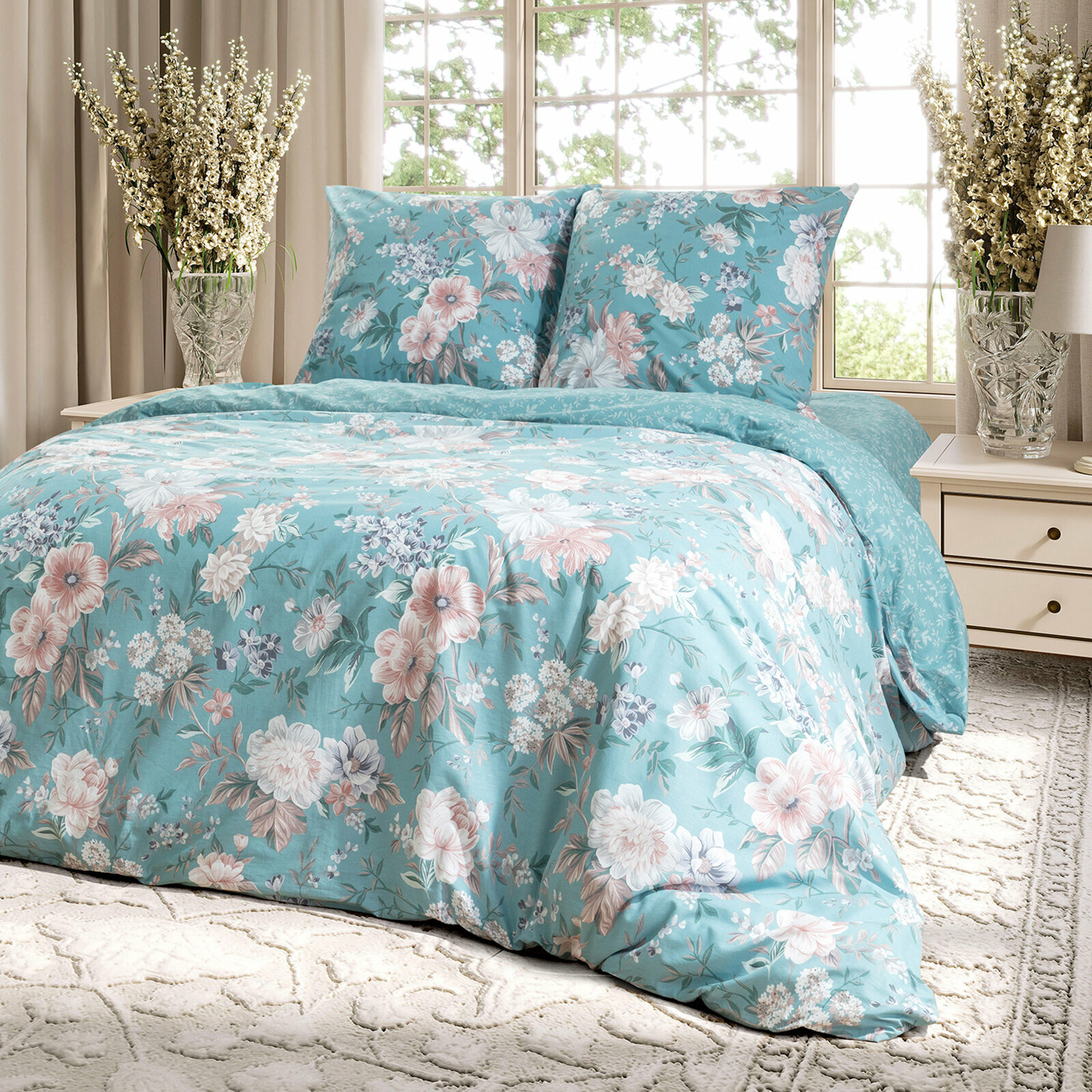 Отзывы на Постельное белье Евро Mia Cara, Перкаль, нав. 70х70, Чарующий сад, пастельно-бирюзовый