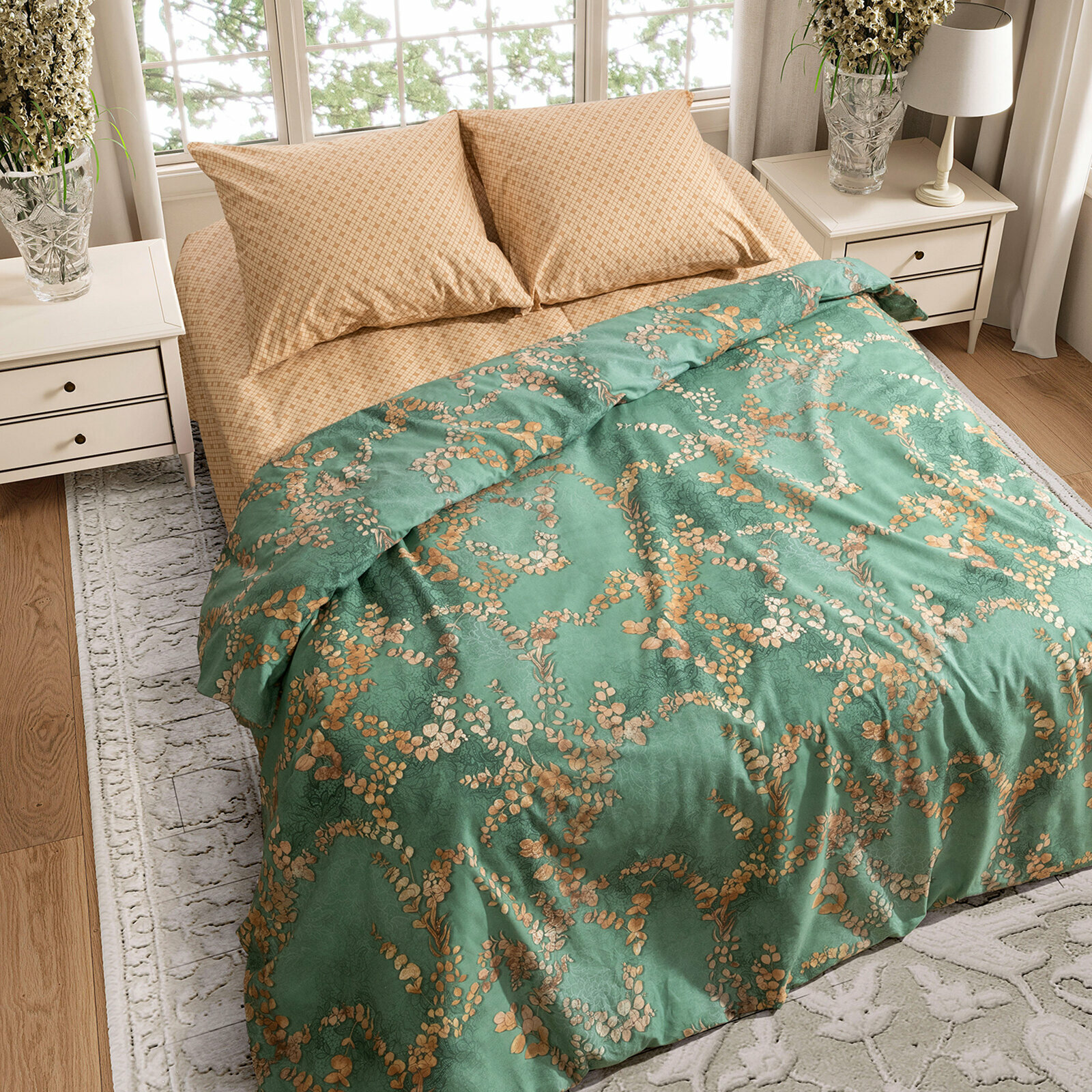 Постельное белье Евро Mia Cara, Перкаль, нав. 70х70, Таинственный сад, зеленый информация: