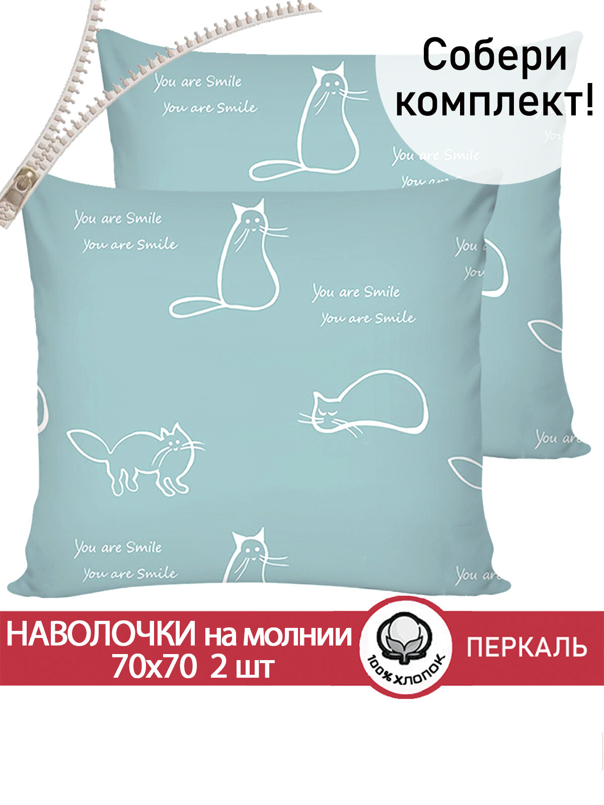 Отзывы на Наволочка 2шт на молнии 70х70 см Сказка "Котики (мята)", ткань перкаль, 100% хлопок