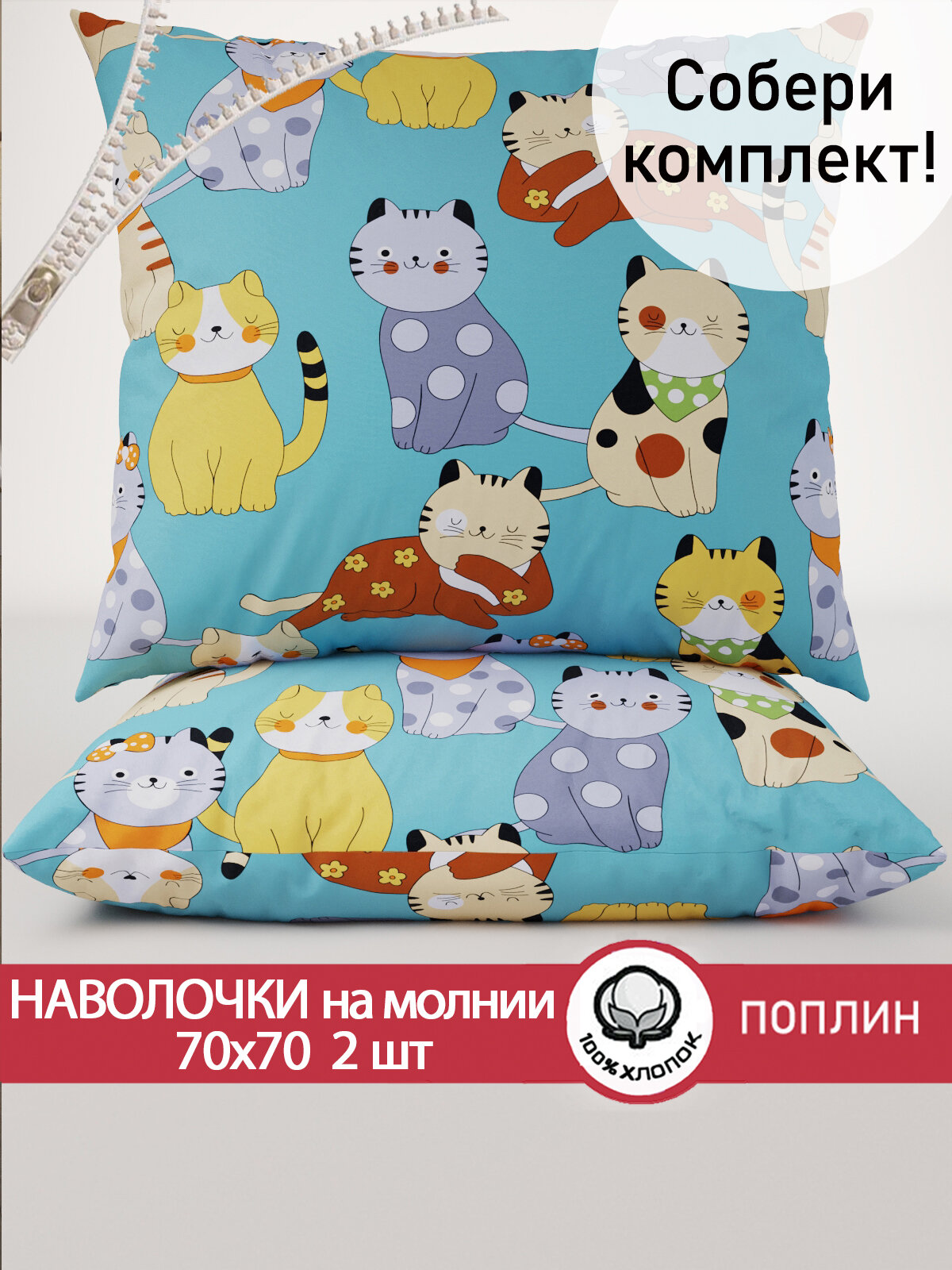 Наволочка 2шт на молнии 70х70 см Сказка "Мурлыки", ткань поплин, 100% хлопок информация: