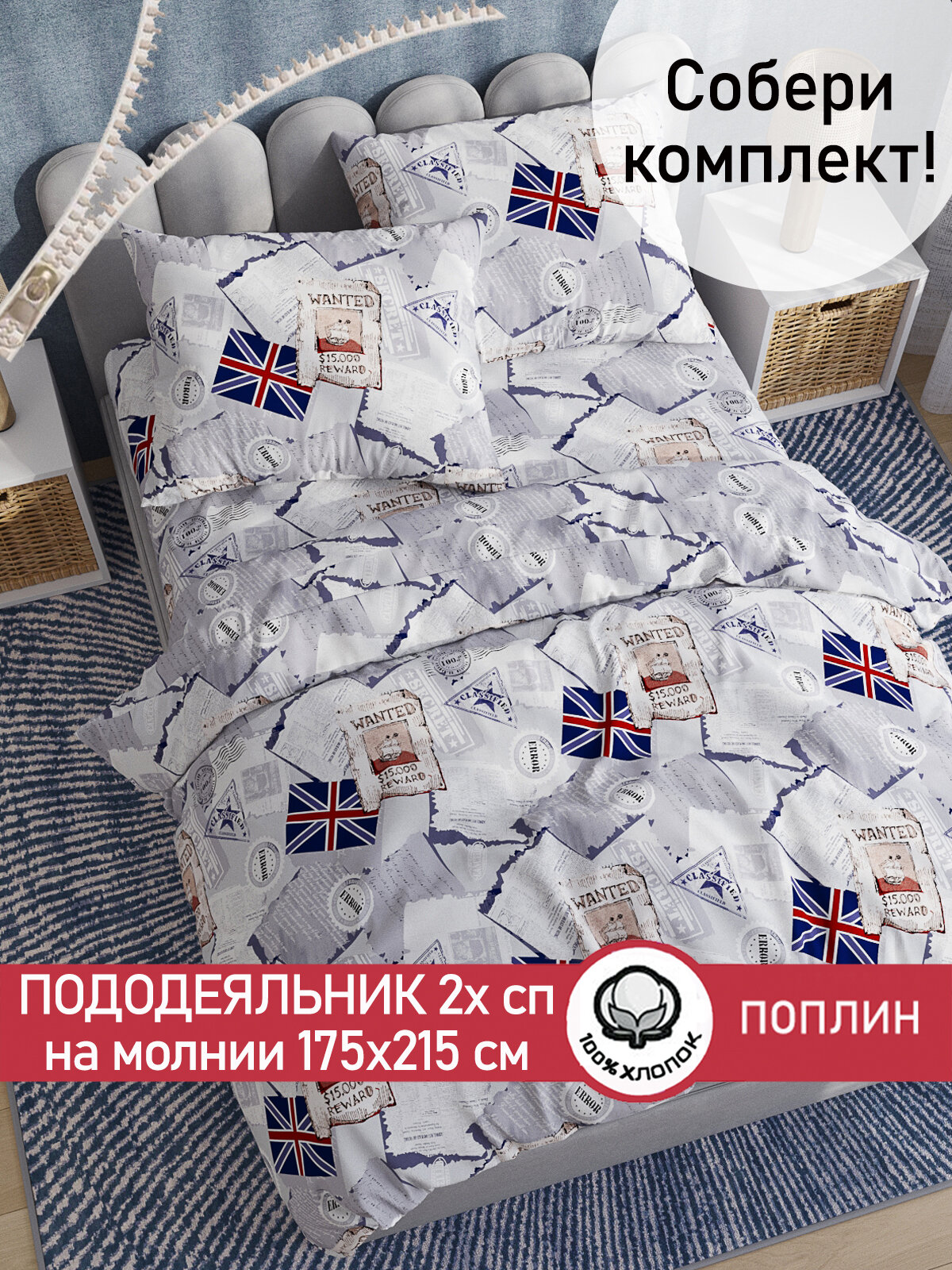 Пододеяльник 175х215 см на молнии, 2-спальный, Сказка "WANTED", ткань поплин, 100% хлопок информация: