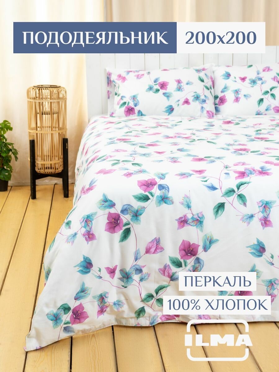 Пододеяльник ILMA 200х200 см, 2 спальный, однотонный хлопок перкаль, цветы на белом фоне информация: