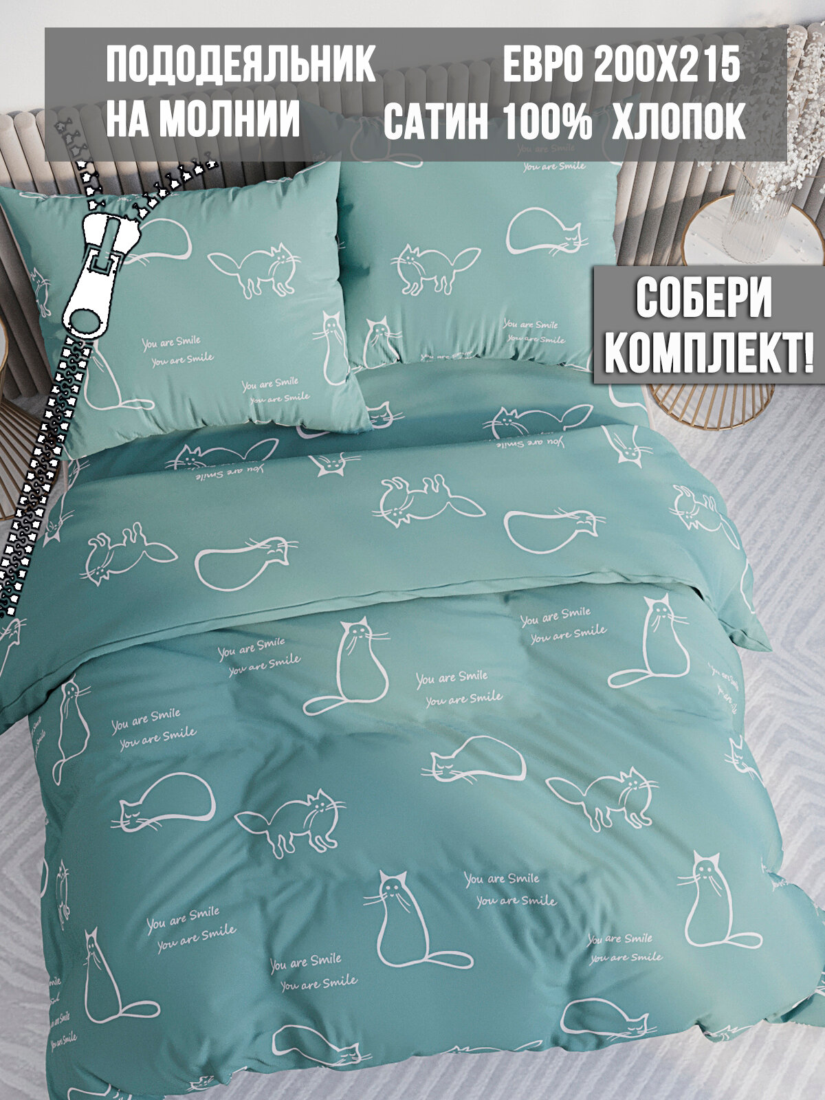 Пододеяльник Milky Garden "Котики (мята)" 200х215 см евро, на молнии, сатин, хлопок 100% информация: