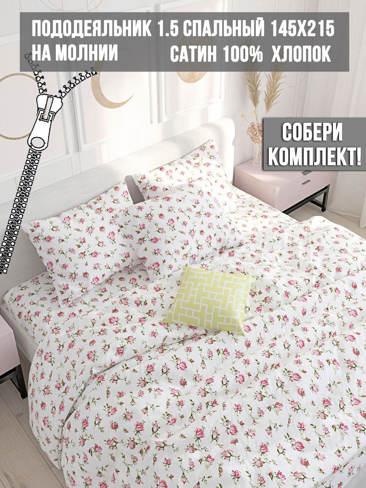 Пододеяльник на молнии сатин Milky Garden "Розы" 1,5-сп 145х215 см информация: