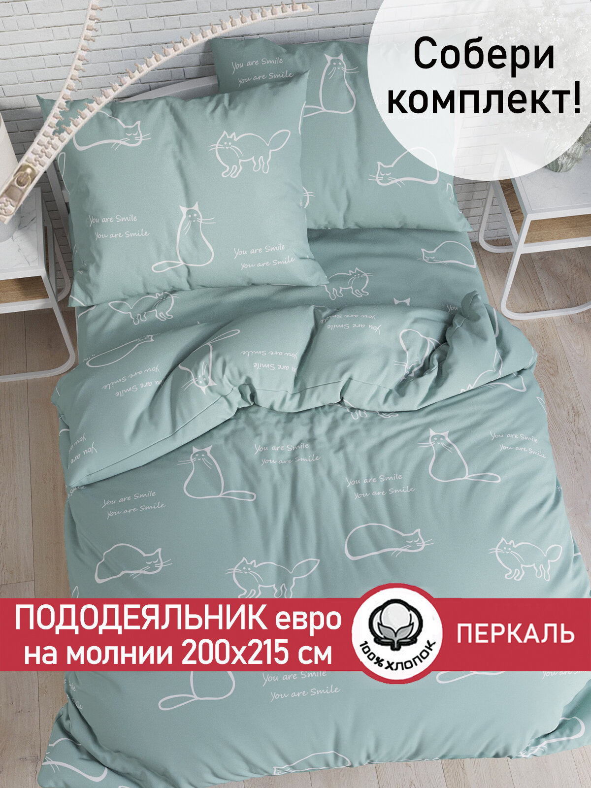 10 цен на Пододеяльник 200х215 см на молнии, евро, Сказка "Котики (мята)", ткань перкаль, 100% хлопок