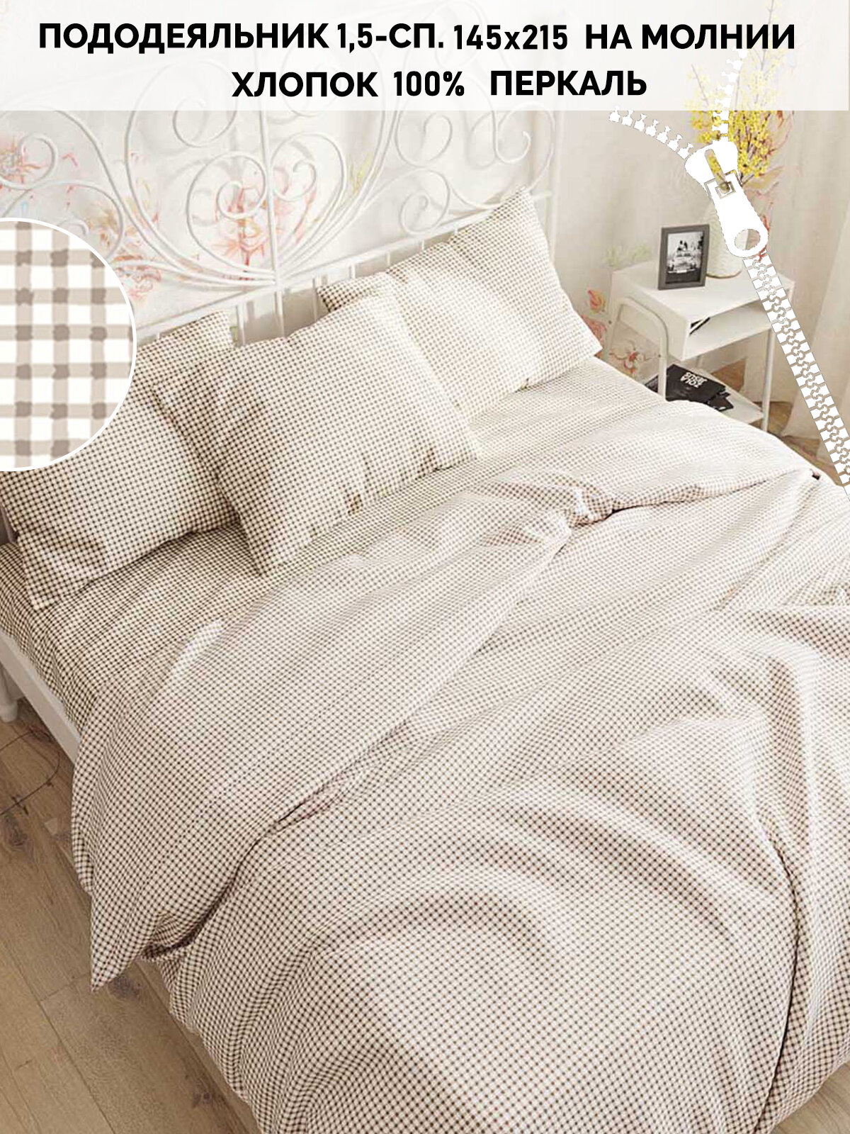 Пододеяльник Кот Коттон "Бежевая клеточка" 1,5-сп 145х215 см информация: