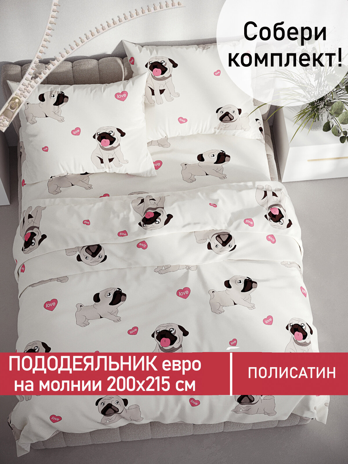 Пододеяльник 200х215 см на молнии, евро, Мечта "Мопсики", ткань полисатин информация: