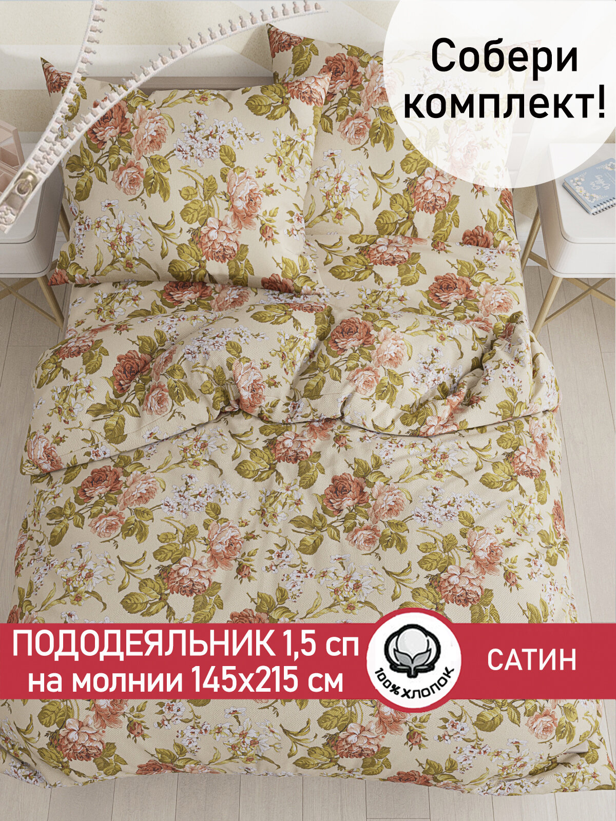 Отзывы на Пододеяльник 145х215 см на молнии, 1,5 спальный, Сказка Сатин "Винтаж", ткань сатин, 100% хлопок