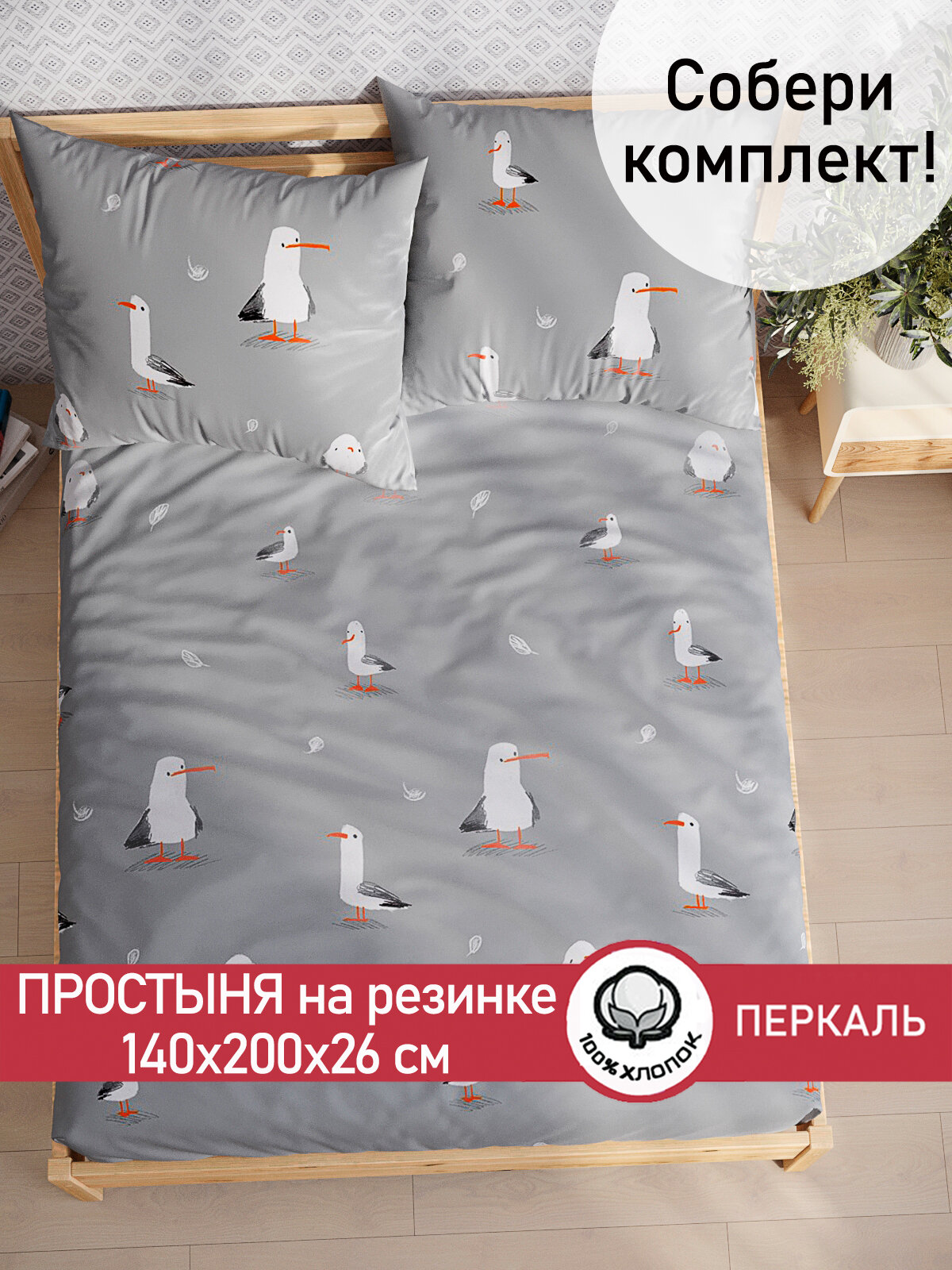 Простынь на резинке Сказка "Морская птица" 140х200 см, ткань перкаль, 100% хлопок, высота 26 см информация: