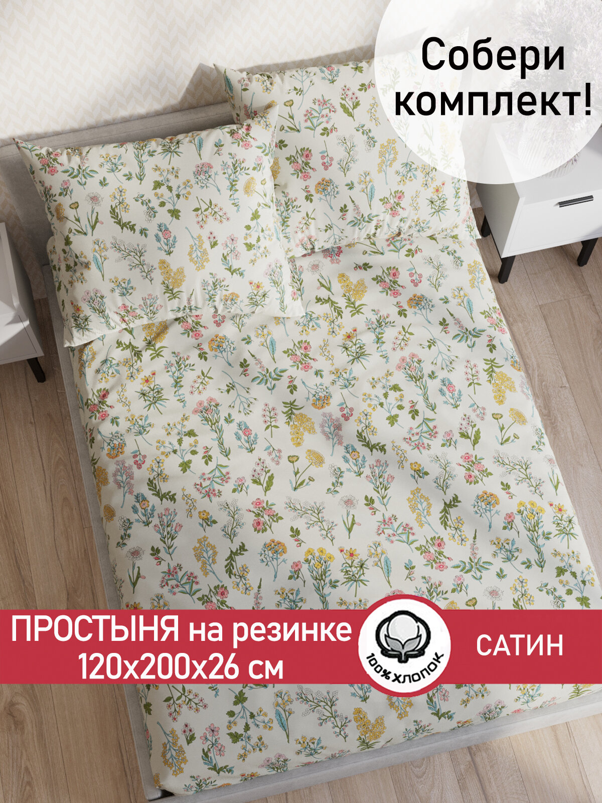 10 цен на Простынь на резинке Сказка Сатин "Botany" 120х200 см , ткань сатин, 100% хлопок